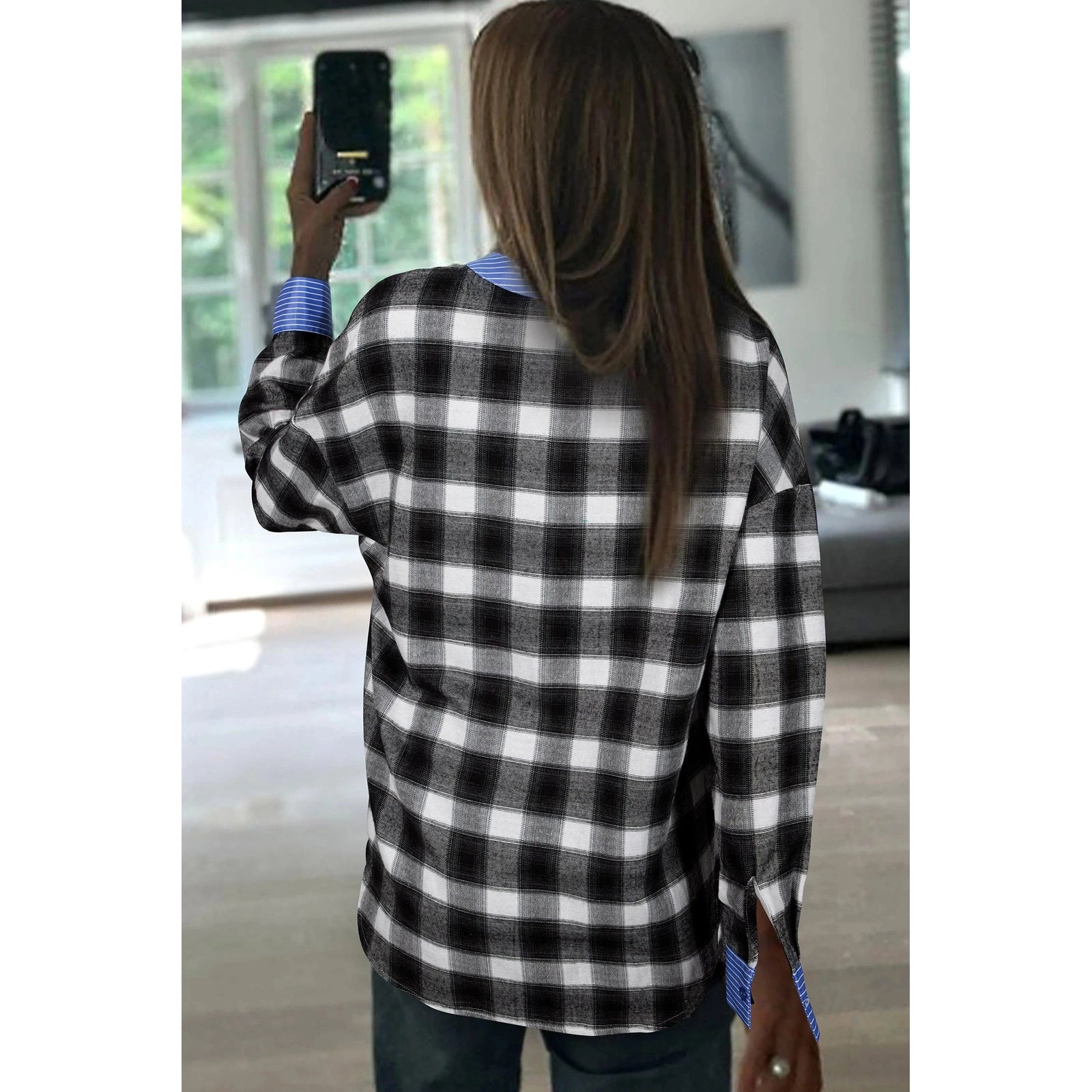 - Chic plaid blouse featuring contrast striped edges for a modern touch.