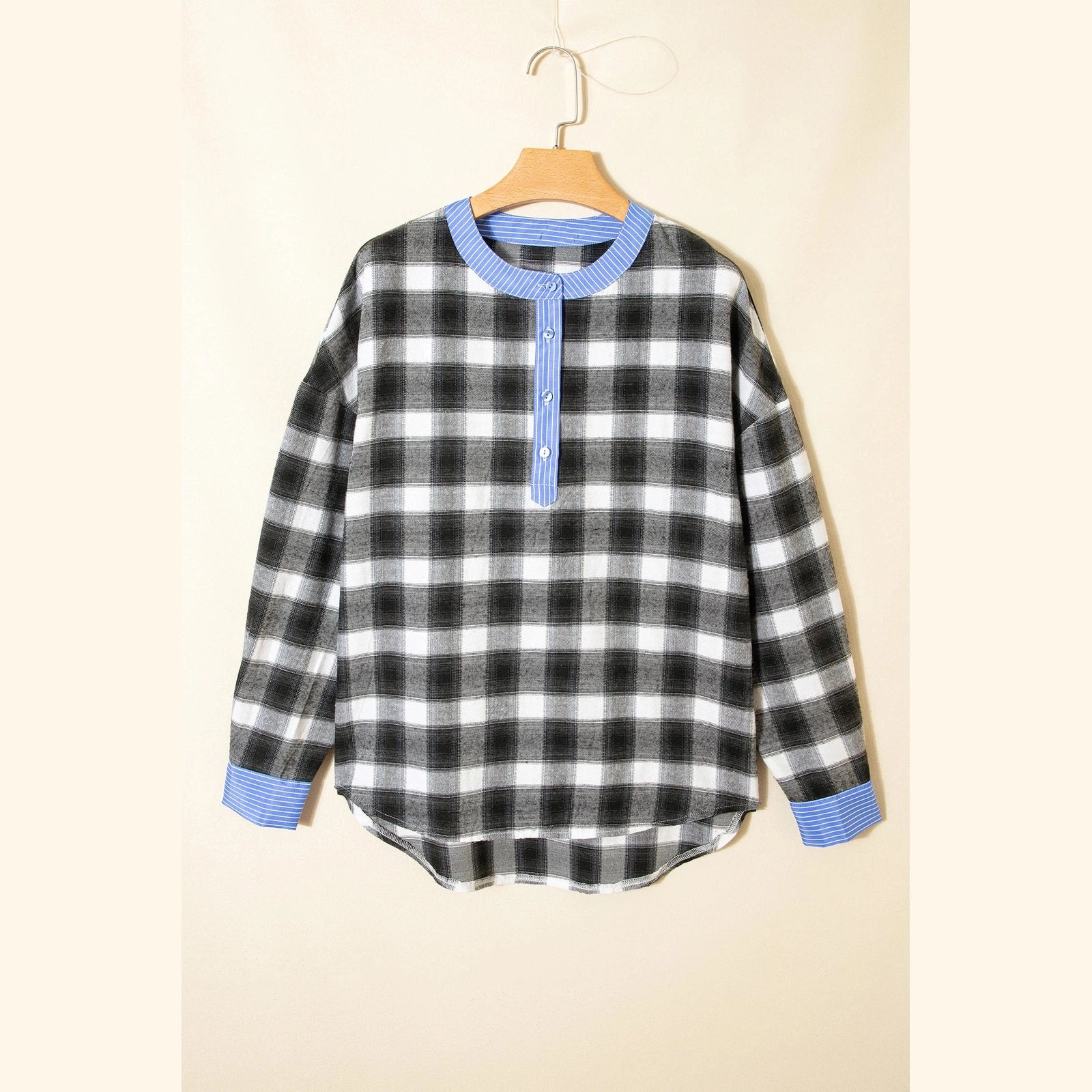Alee Black Contrast Striped Edge Half Placket Plaid Blouse