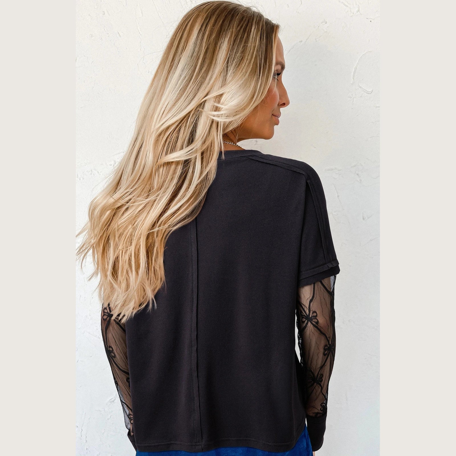 Alyse Black Bow Textured Patchwork Long Sleeve Tee