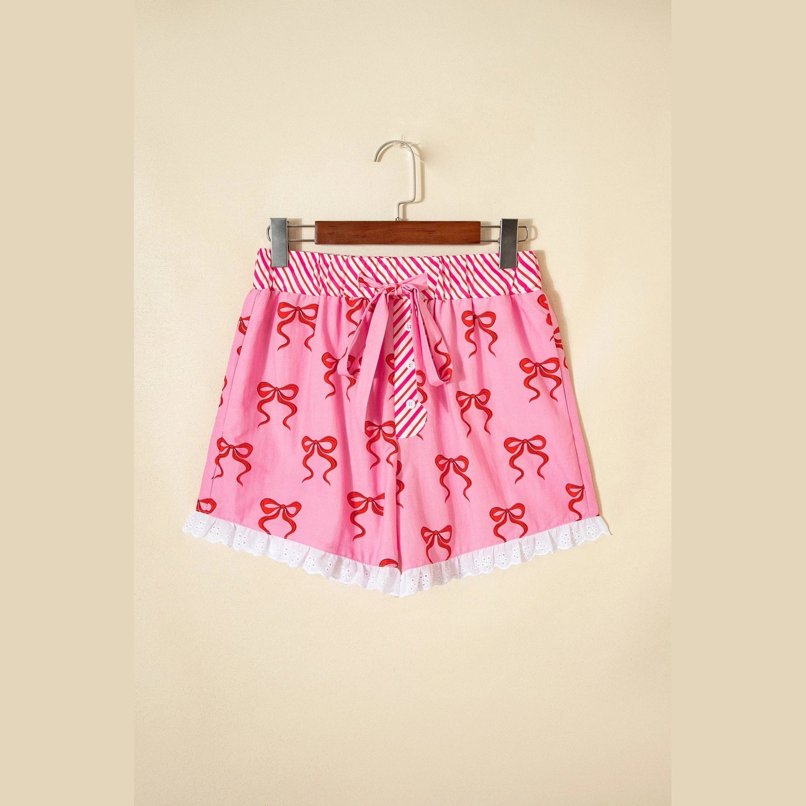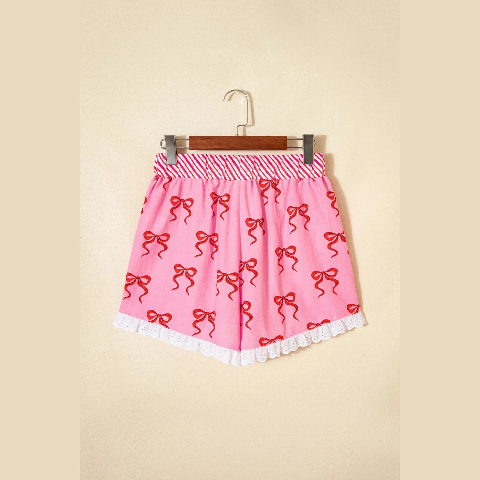 Alyx Pink Bow Print Striped Patchwork Elastic Waist Lace Trim Loose Shorts