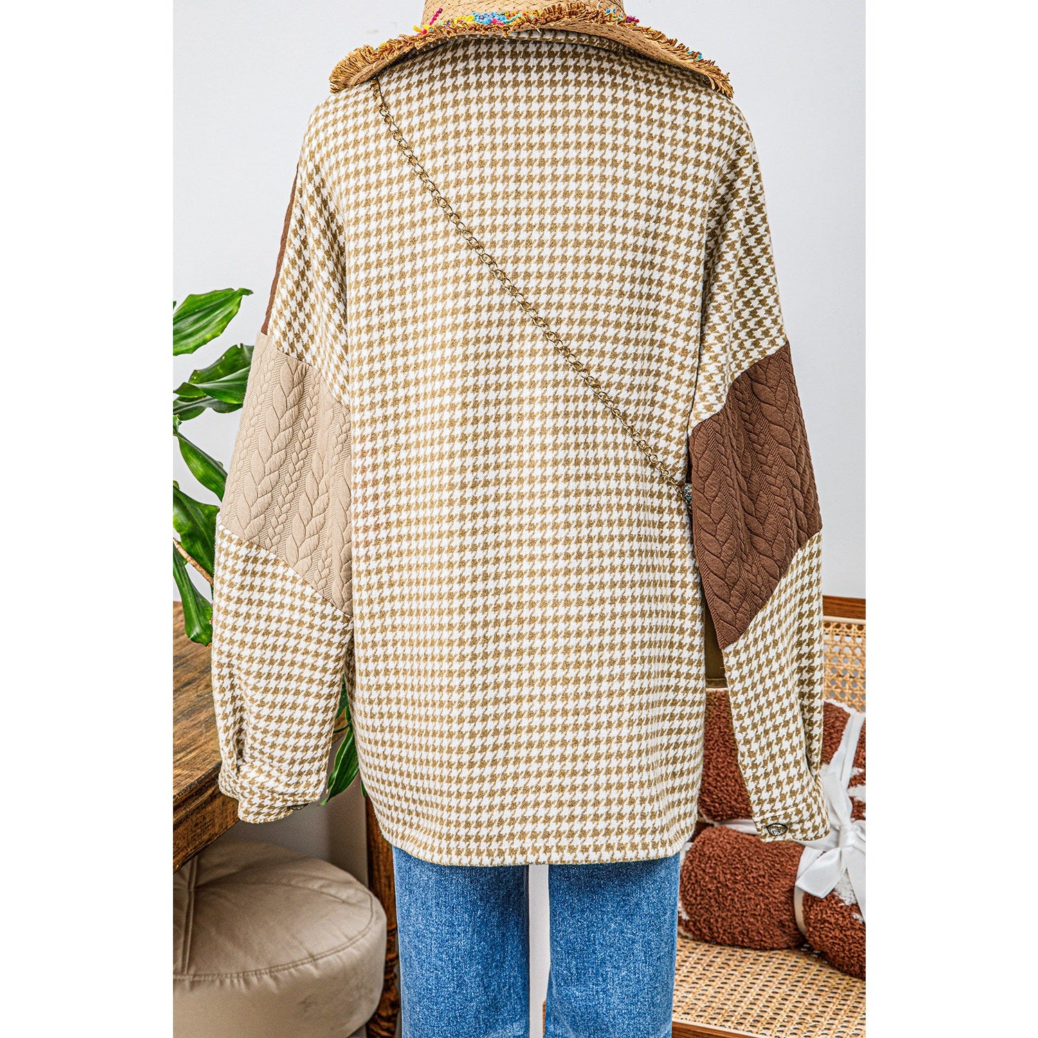 Ava Grace Khaki Houndstooth Color Contrast Textured Patchwork Loose Shacket