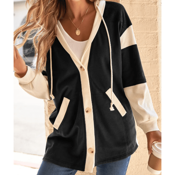 Bonnel Black Waffle Contrast Knit Color Block Patchwork Button Front Oversize Hoodie