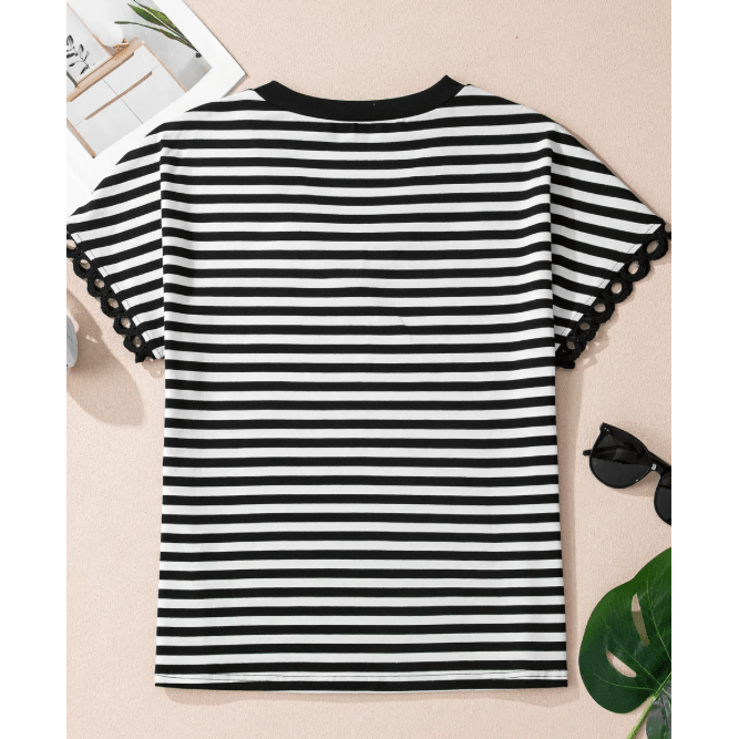 Brexa Black Striped Print V Neck Delicate Trim Casual Tee