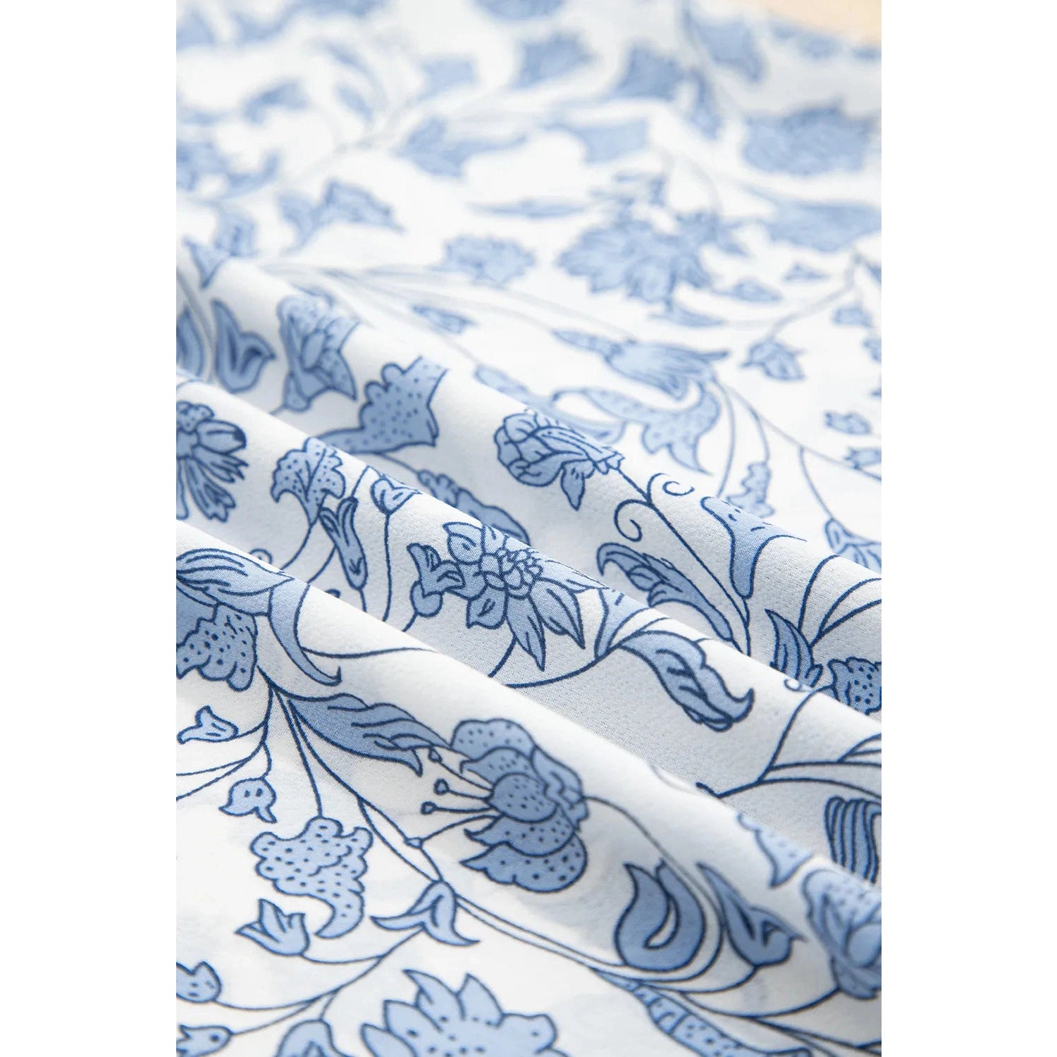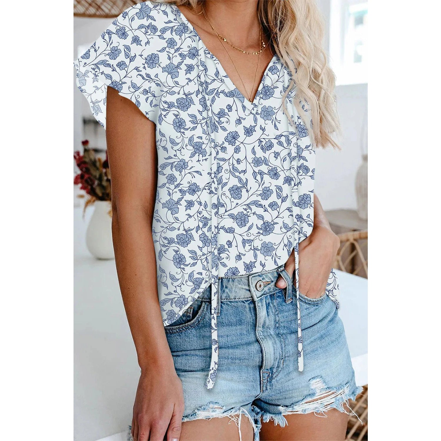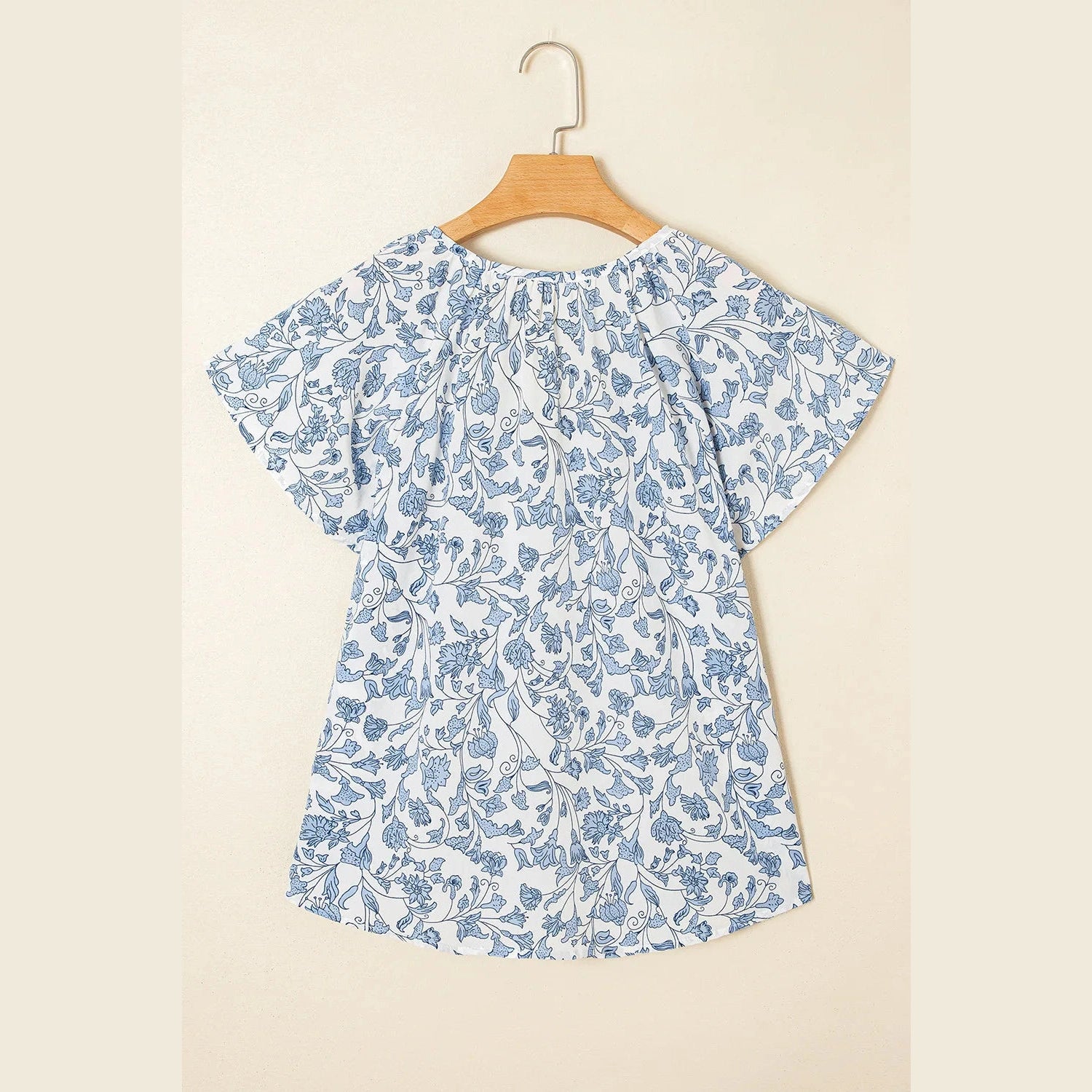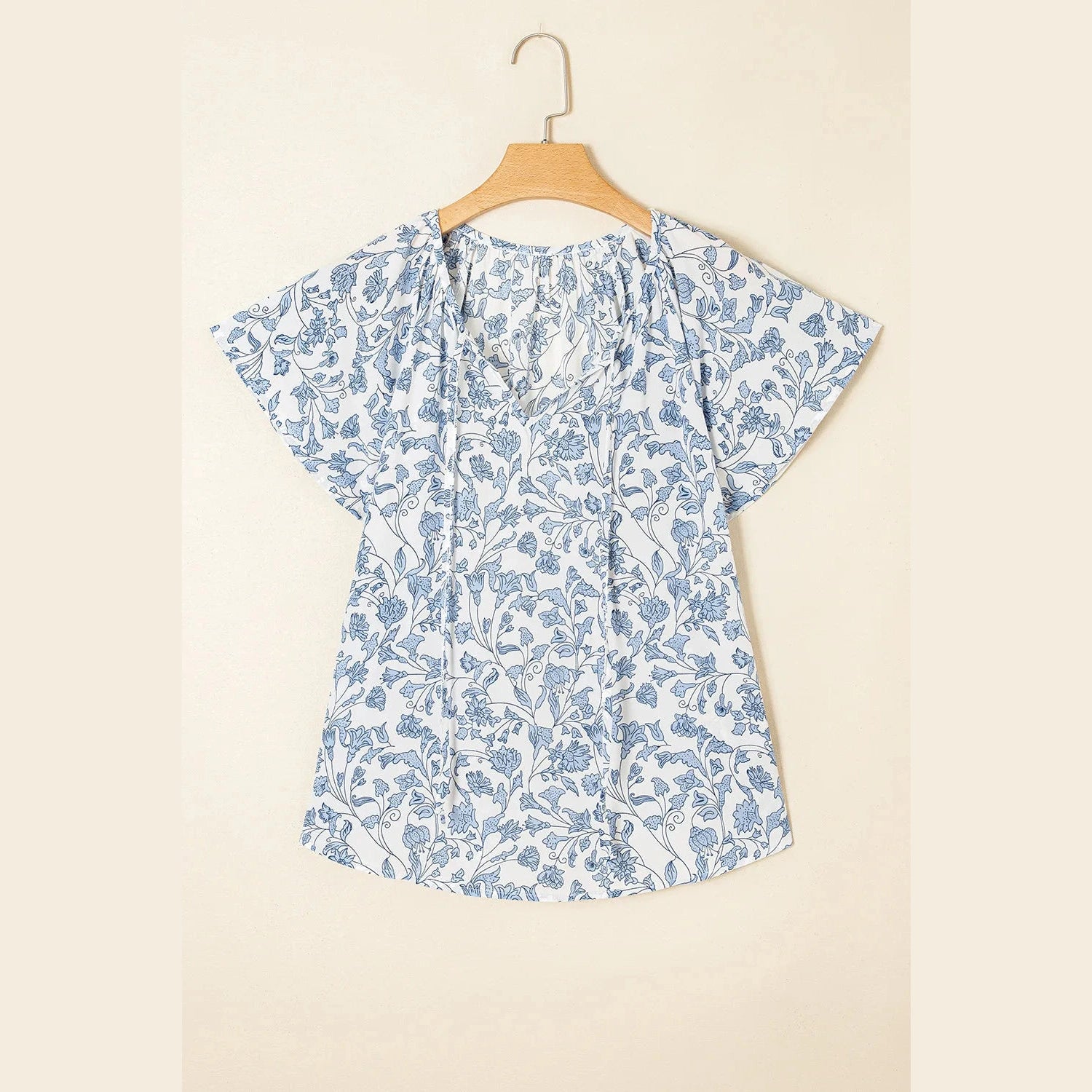 Camryn Sky Blue V-neck Short Sleeve Fashion Print Fantasy Fluttering Blouse