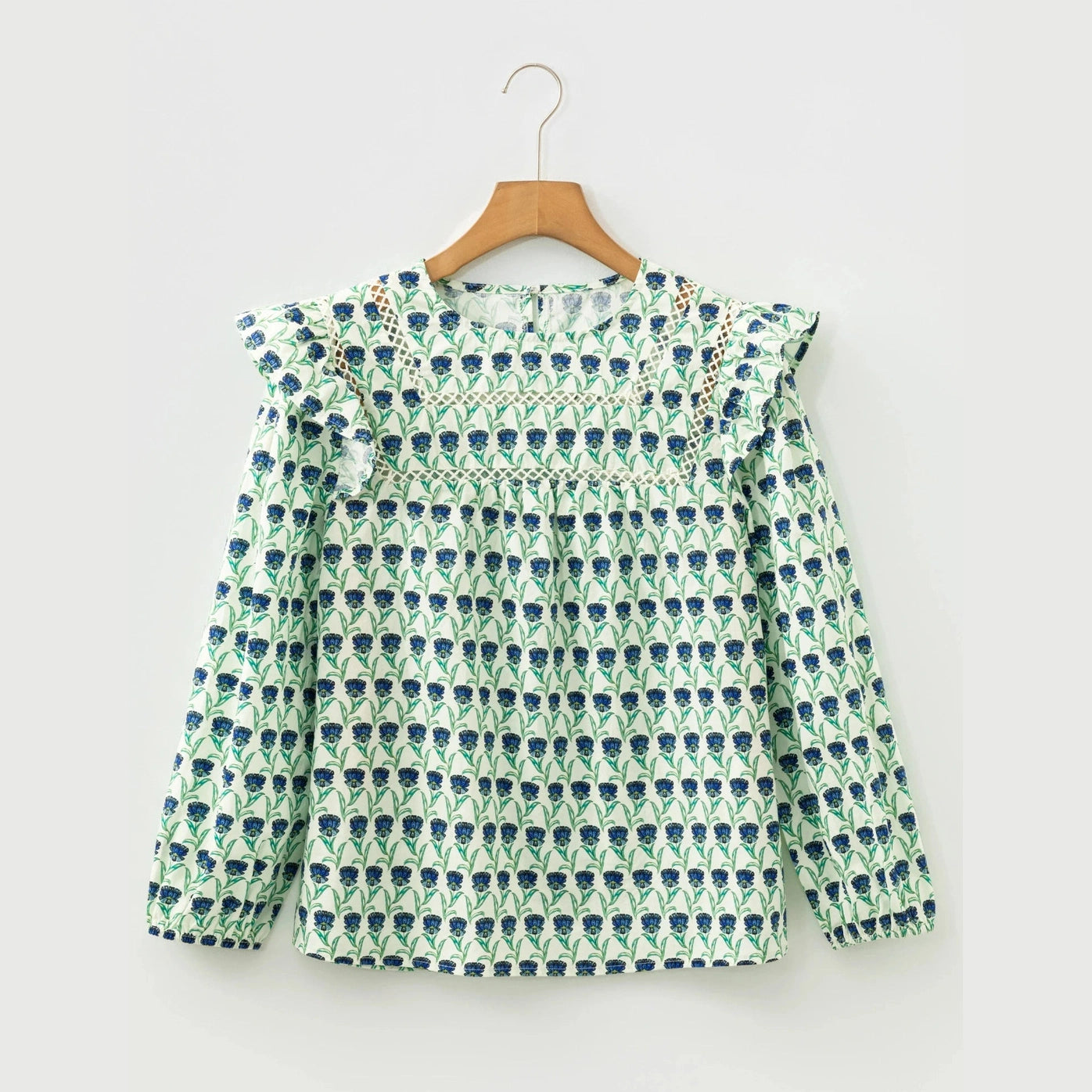 Carla Green Floral Print Lace Detail Ruffle Trim Long Sleeve Blouse