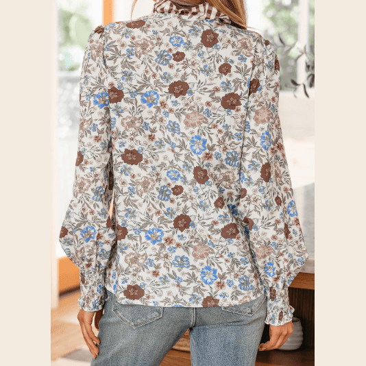 - Plaid frilled trim adds contrast chic detail to this fall floral blouse.