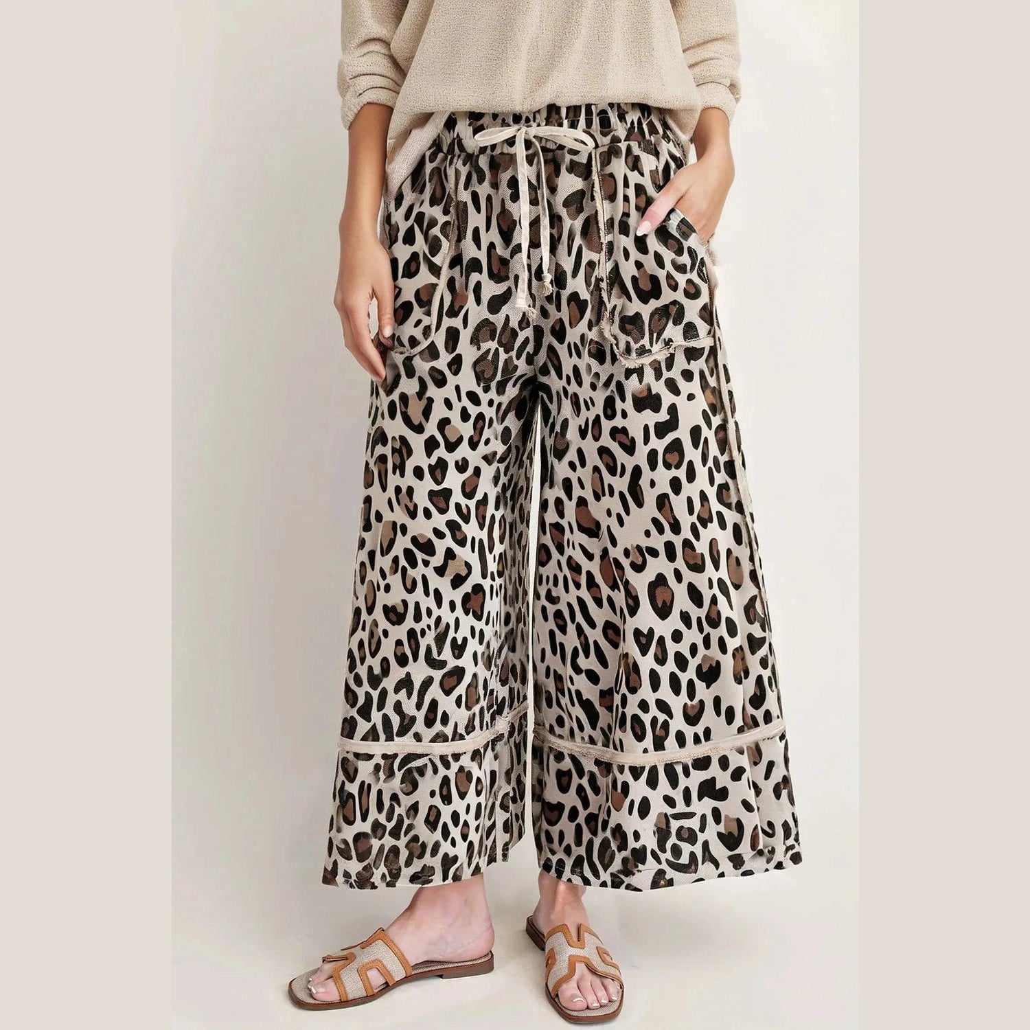 - Bold leopard print adds fierce flair to these trendy cropped wide leg pants for women.