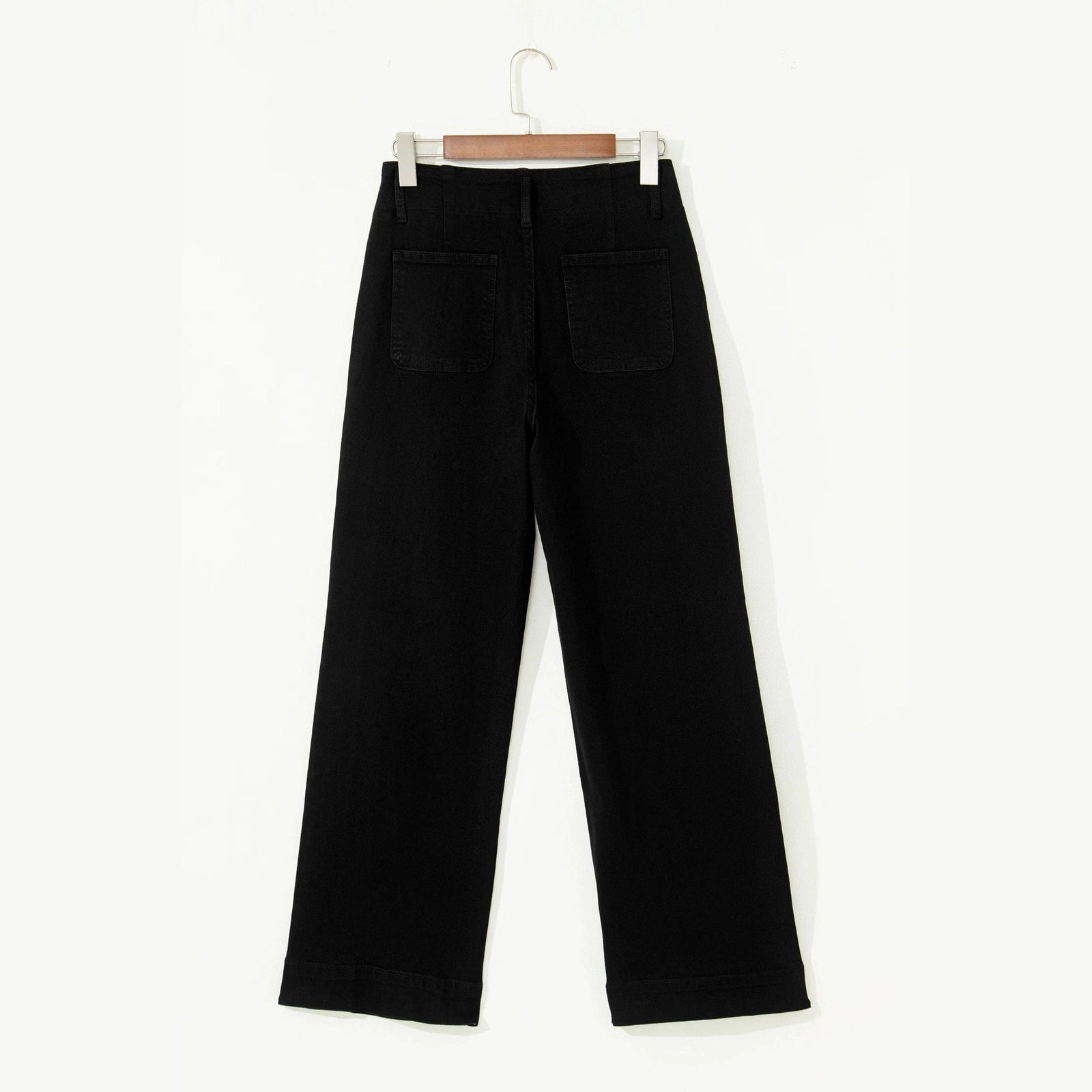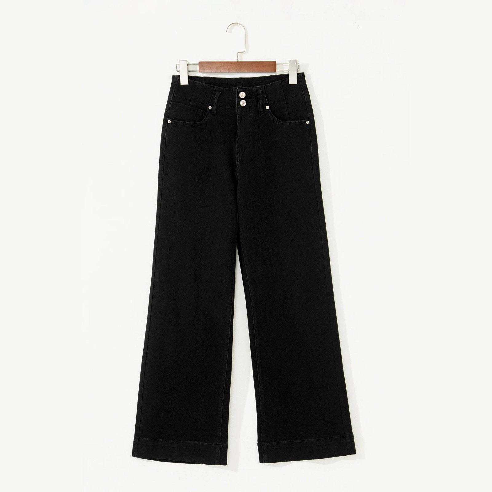 - Chic black flared jeans with a flattering high waist and double-button design.