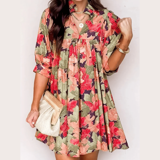 Charlene Green Floral Print Frilled Collar V Neck Half Sleeve Mini Dress