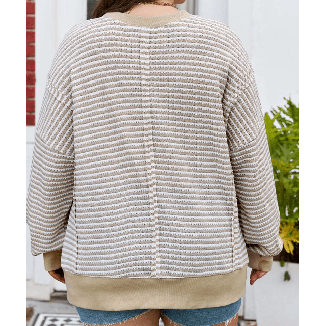 Dayna Brown Stripe Plus Size Breathable Knit Ribbed Trim Long Sleeve Top