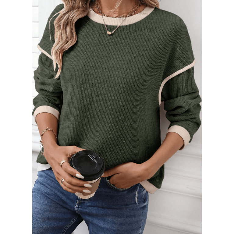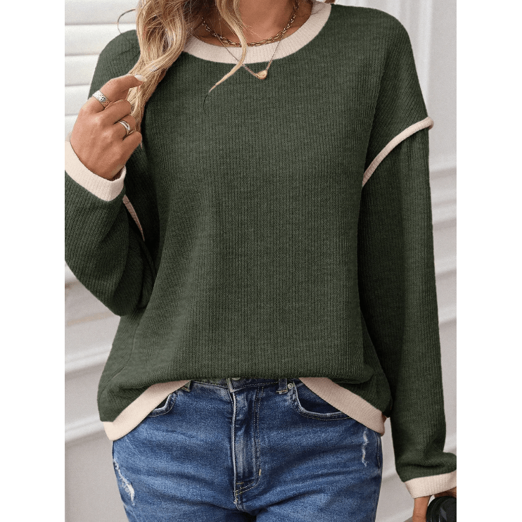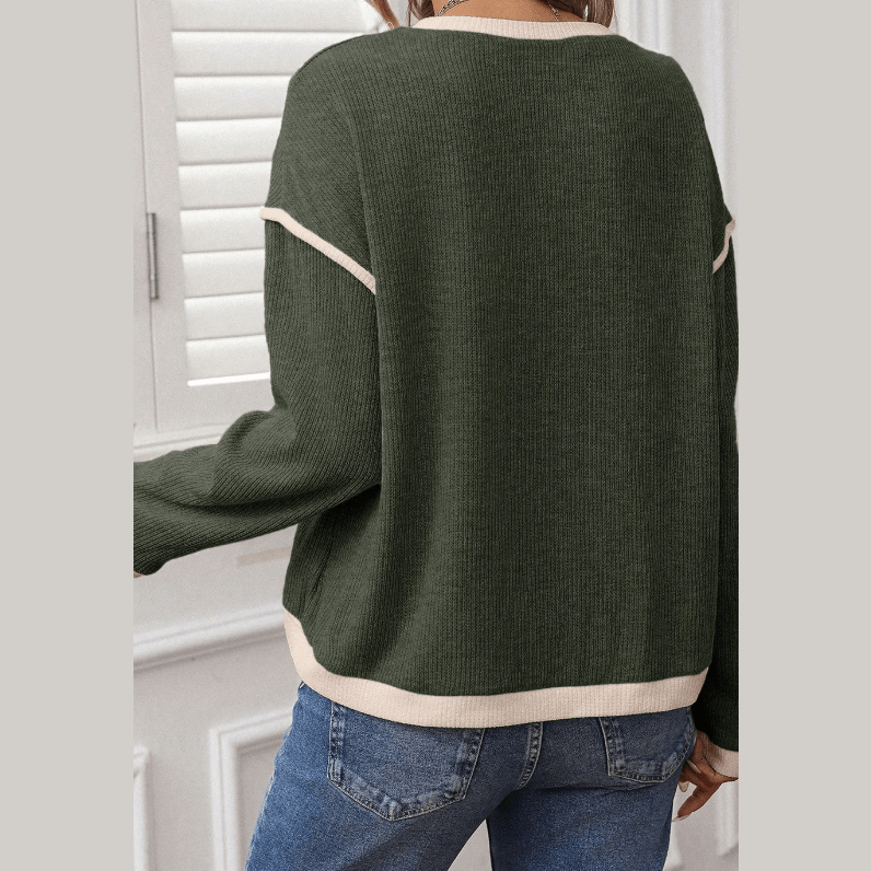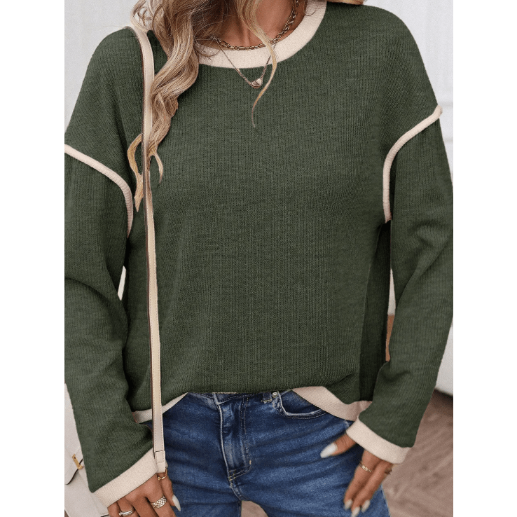 Dayten Green Contrast Color Trim Knit Drop Shoulder Loose Top