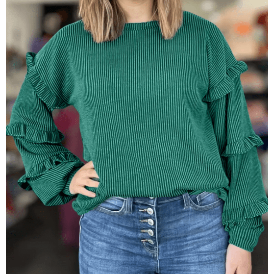 Destiny Evergreen Twisted Ribbed Tiered Ruffles Long Sleeve Pullover Top