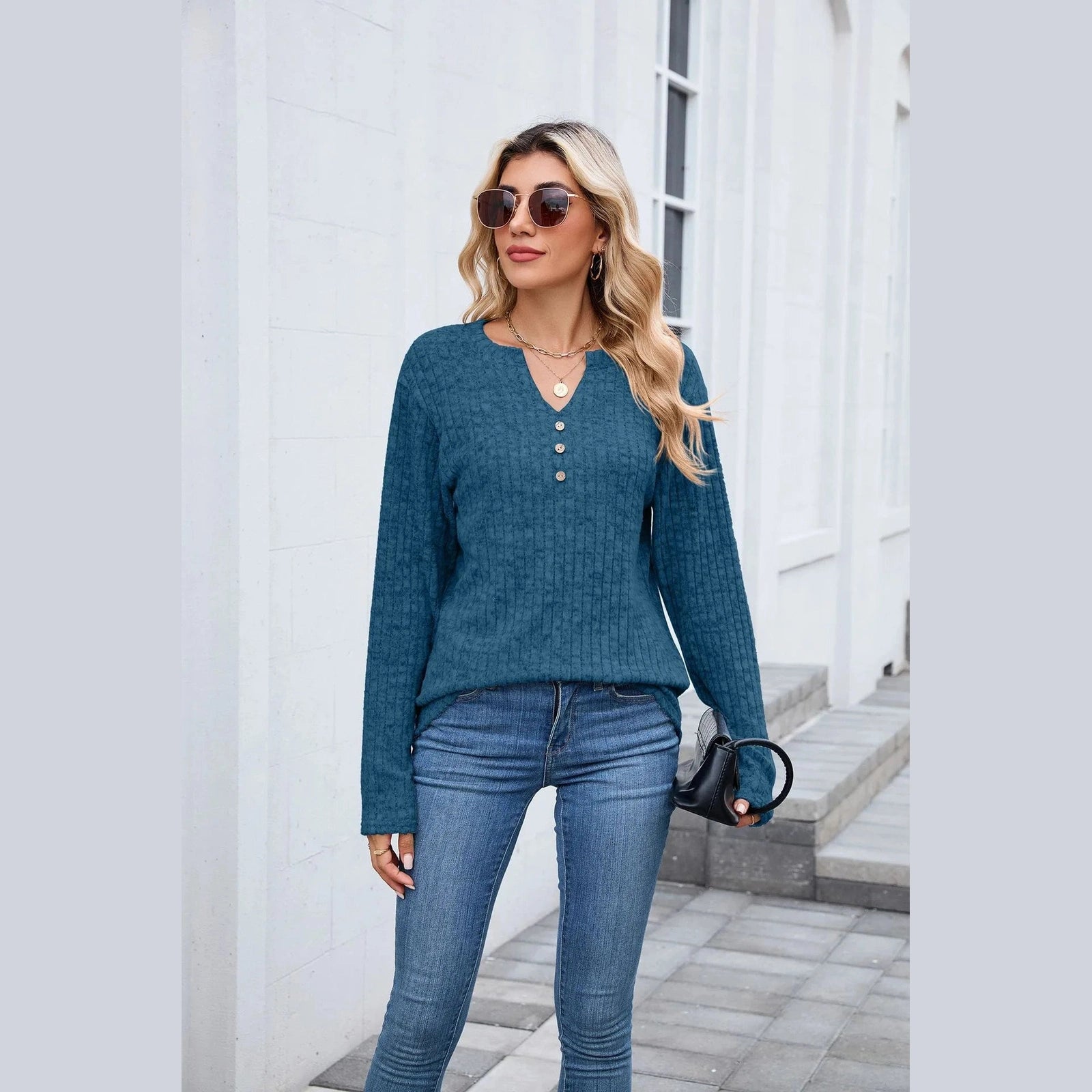 Dusti Peacock Blue V Neck Ribbed Top