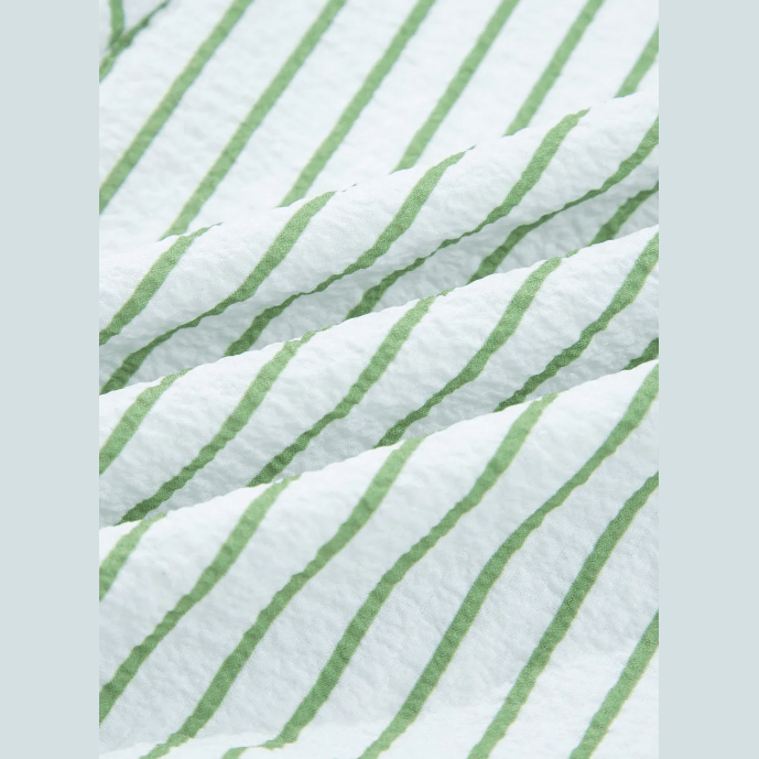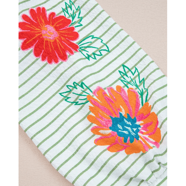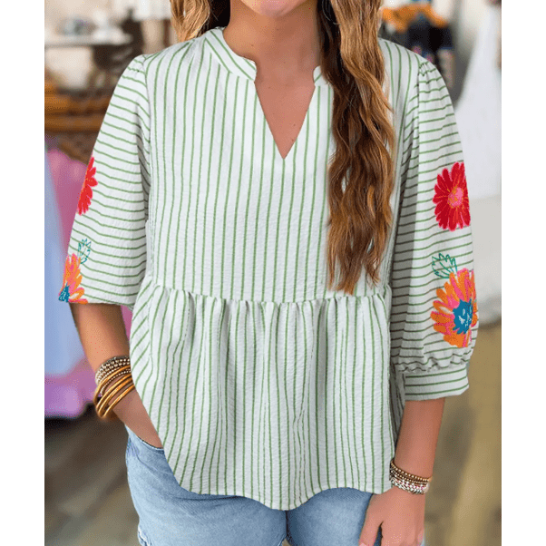 Dusty Green Stripe Flower Puff Sleeve Notched V Neck Babydoll Blouse