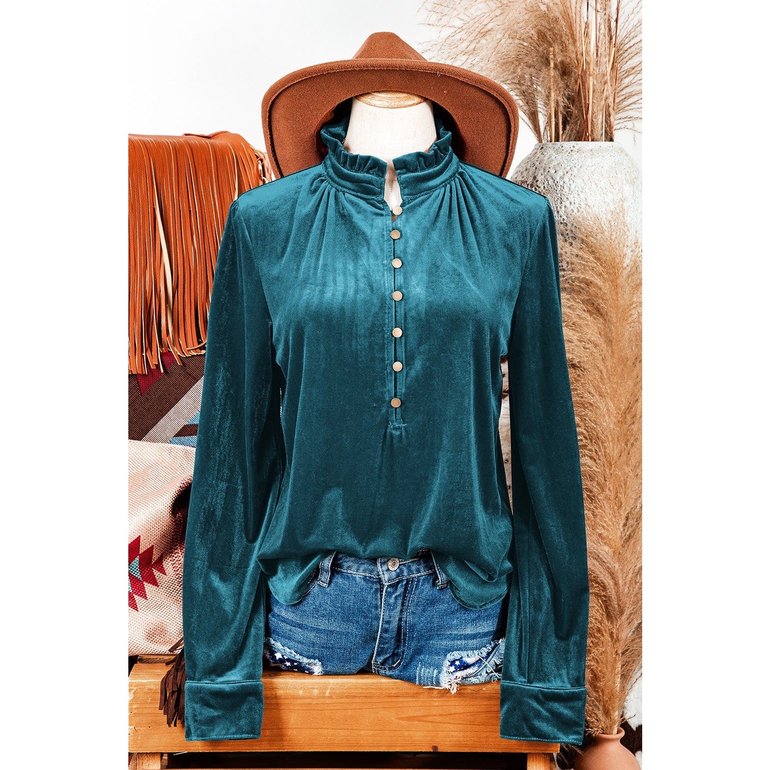 Evalyn Green Frilled Neck Buttoned Front Velvet Top