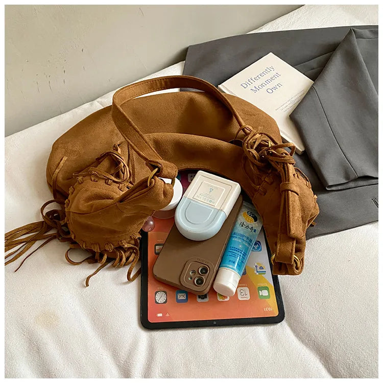 Soft, slouchy, and full of character—this hobo bag blends effortless style with fringe detailing for a laid-back, luxe vibe. Its crescent silhouette hugs comfortably under the arm, while the single strap and roomy interior make it perfect for everyday adventures. Whether you're headed to the market or styling for a casual outing, this bag brings texture, movement, and a touch of wanderlust to your look.