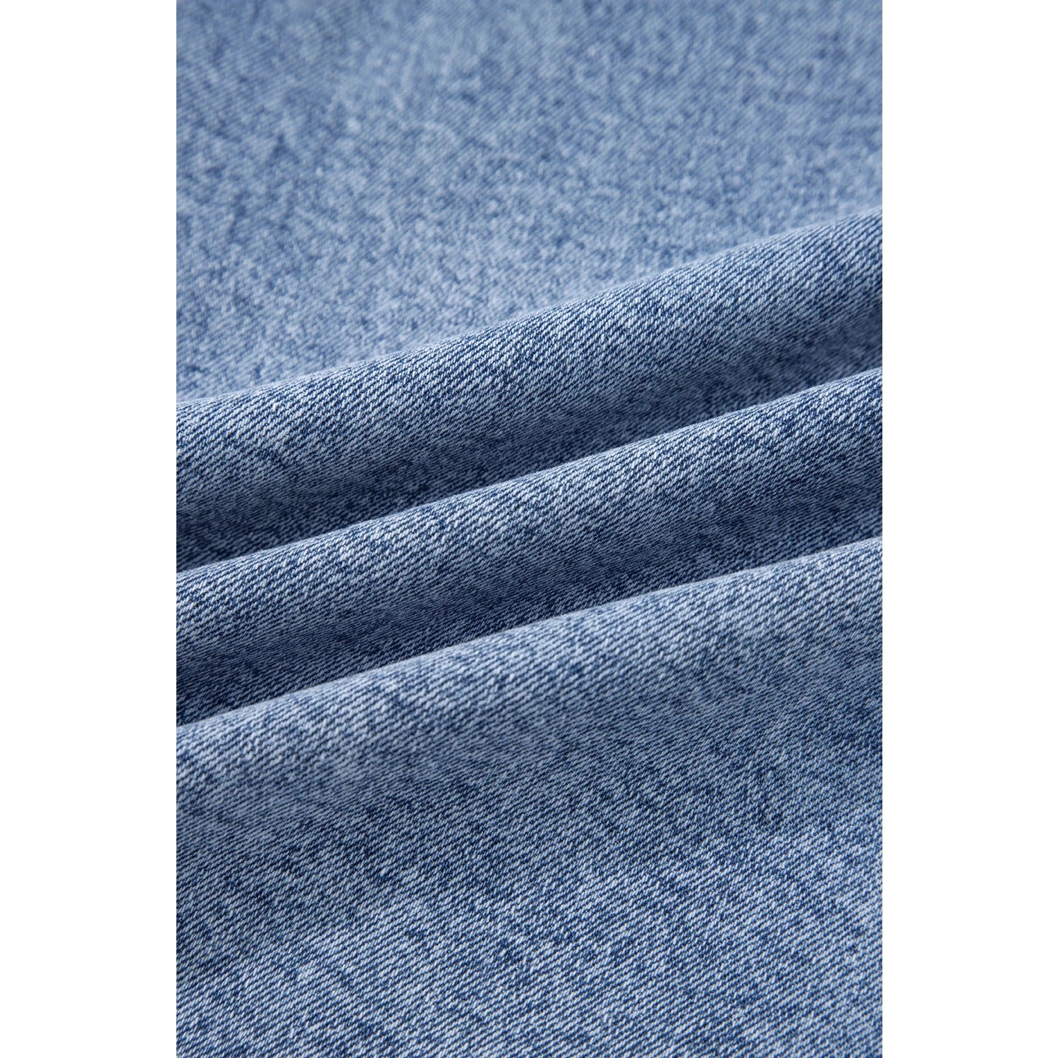 - Medium wash look with exposed seam detailing and large patch pockets.