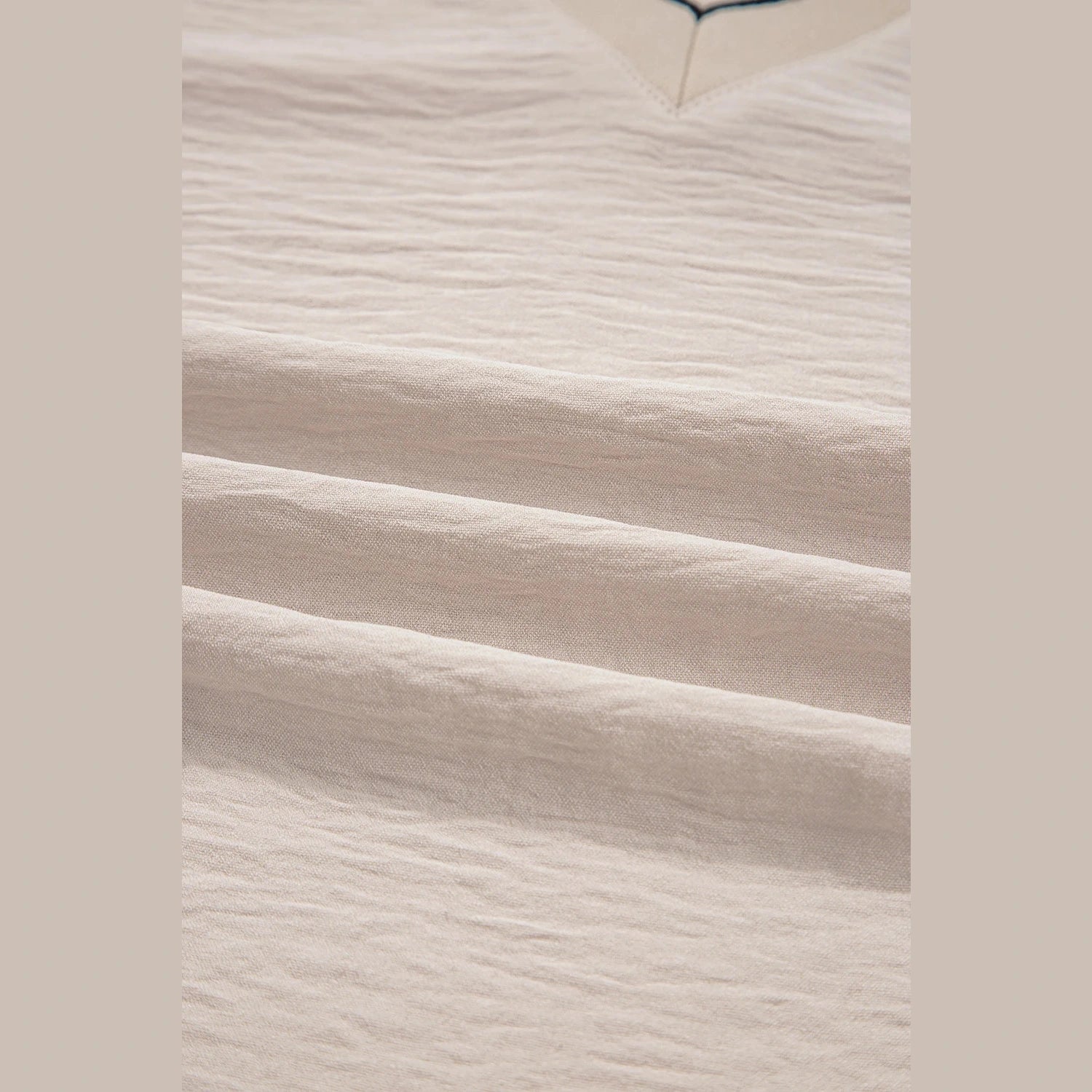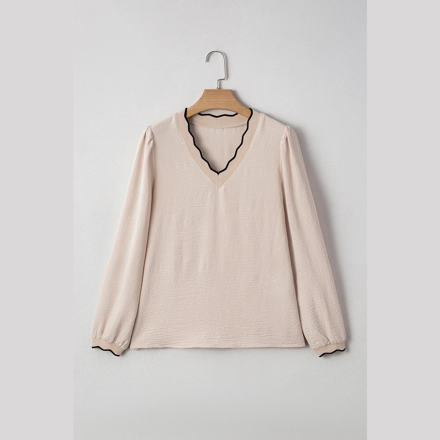 Geneva Contrast Scallop Trim V Neck Long Sleeve Blouse
