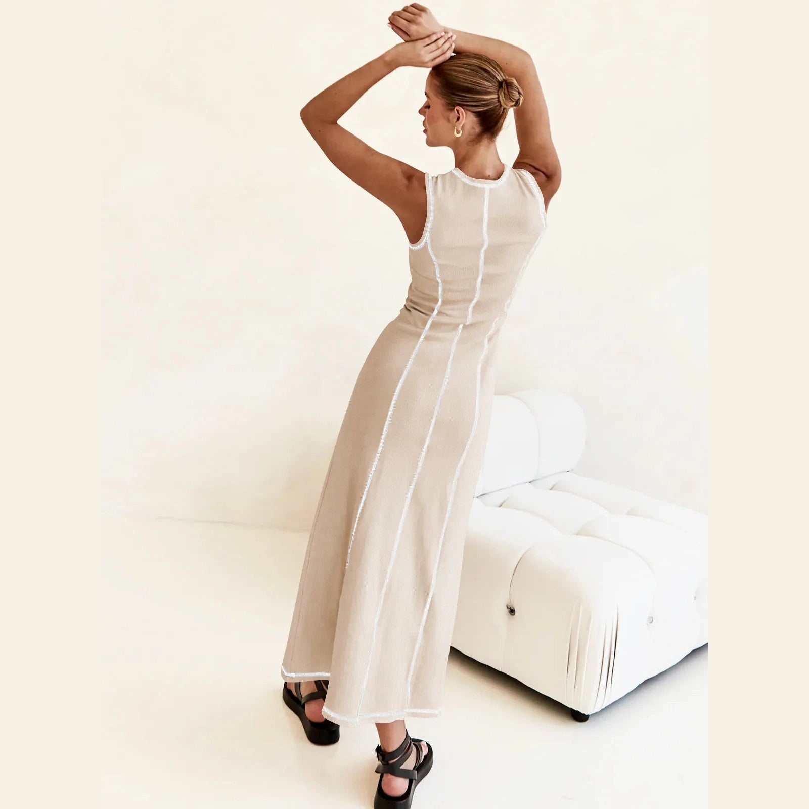Gracia Apricot Sleeveless Longline Dress with Vertical Piping