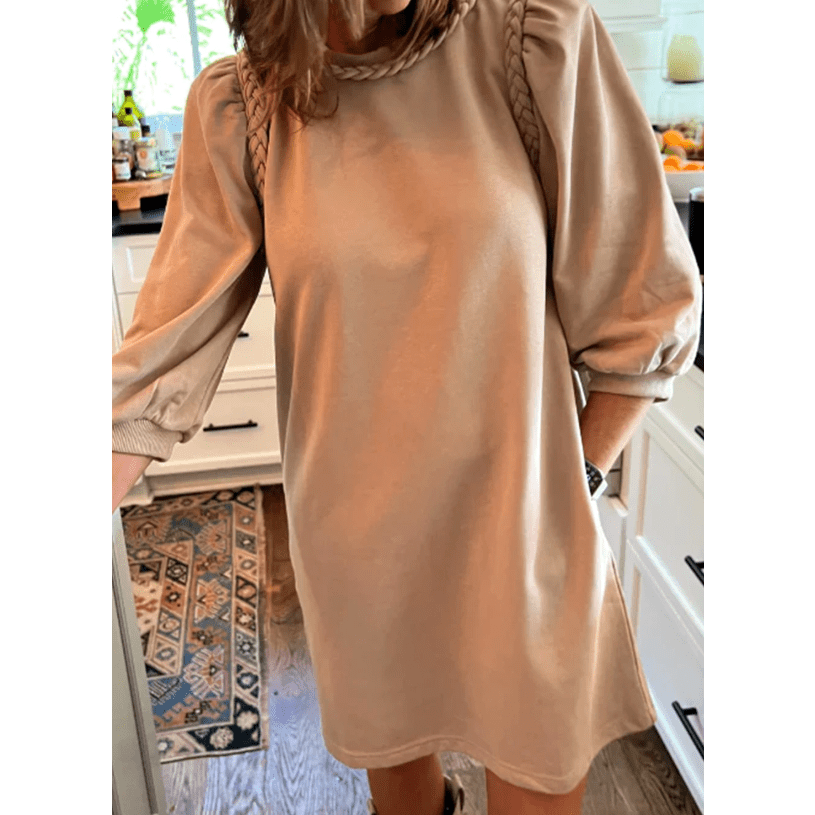 Jaquelle Light French Beige Braided Trim Puff Sleeve Dress