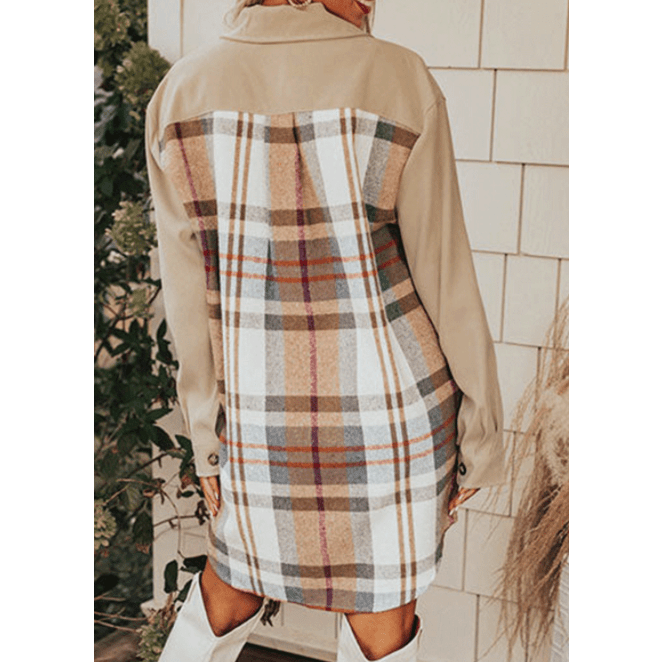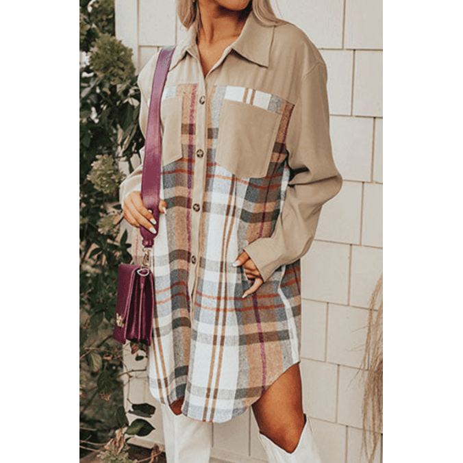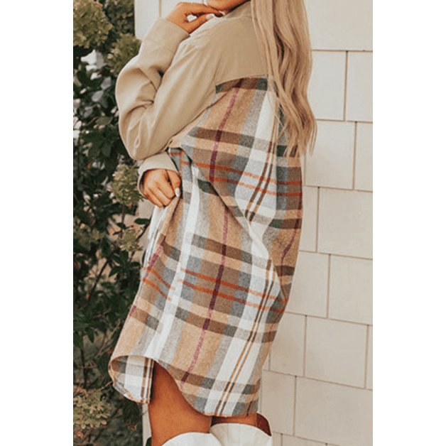 Jolene Khaki Plaid Patchwork Long Sleeve Shirt Mini Dress