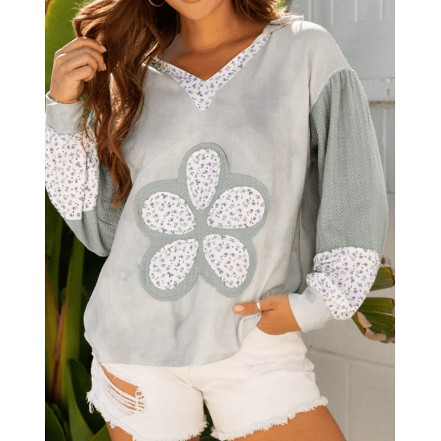 Jorda Green Floral Patched Waffle Textured Colorblock V Neck Casual Hooded Top