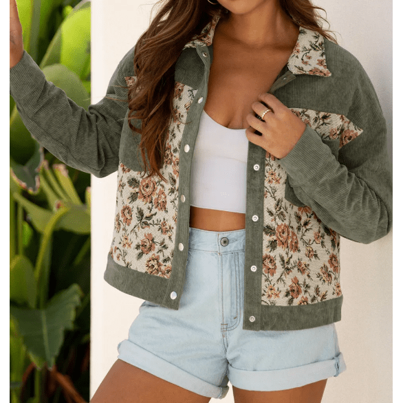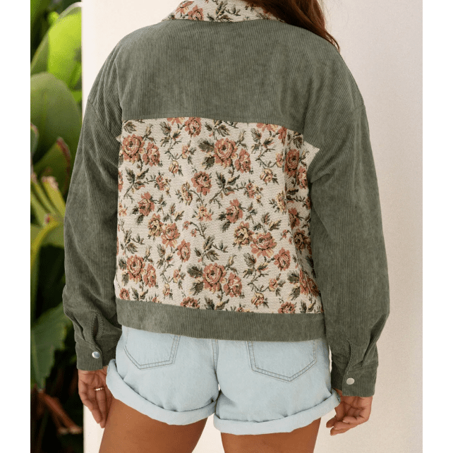 Josie Sage Green Ribbed Retro Floral Patchwork Shirt Style Jacket