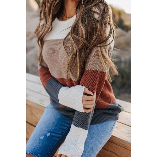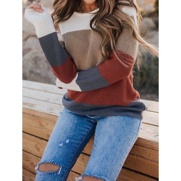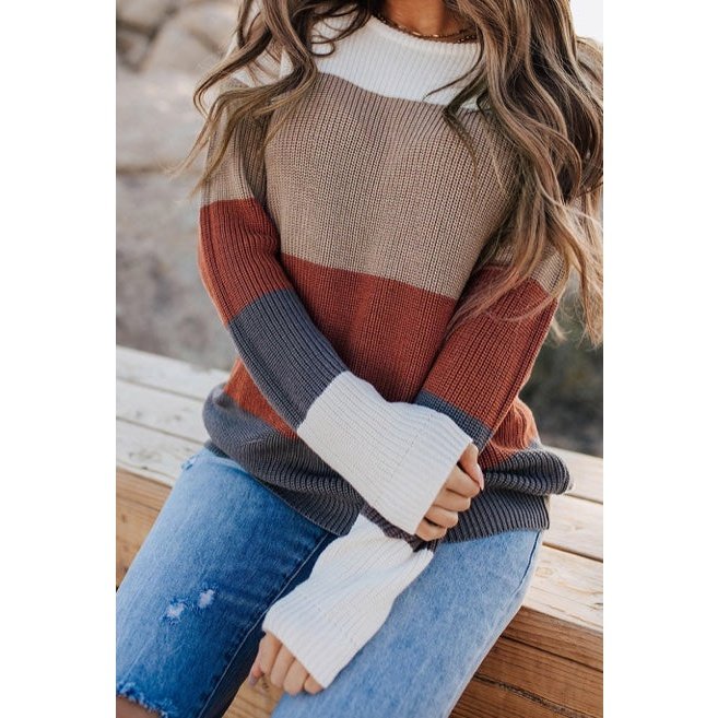 June Rust Color Block Knitted O-neck Pullover Sweater
