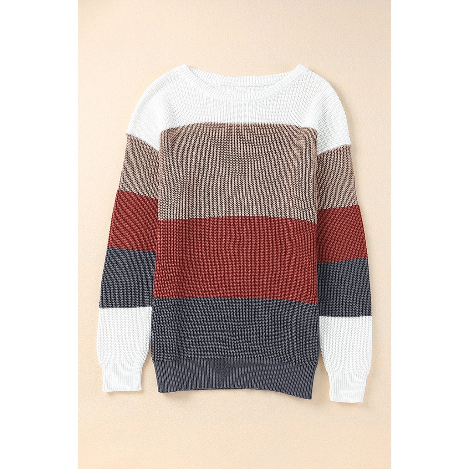 This neutral sweater is fashionable with color block stripes construction