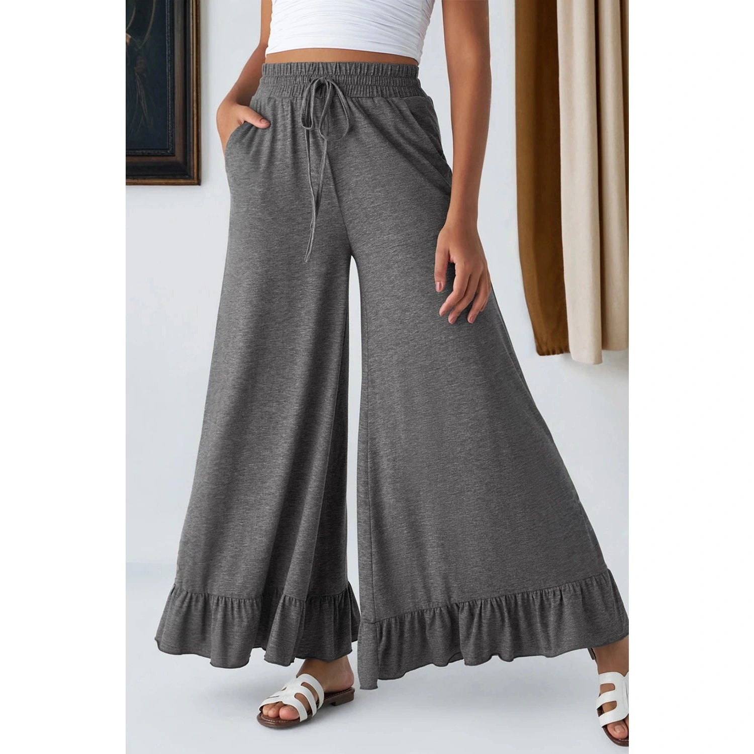 Kendria Grey Ruffled Wide Leg Pull On High Waist Pants with Pockets