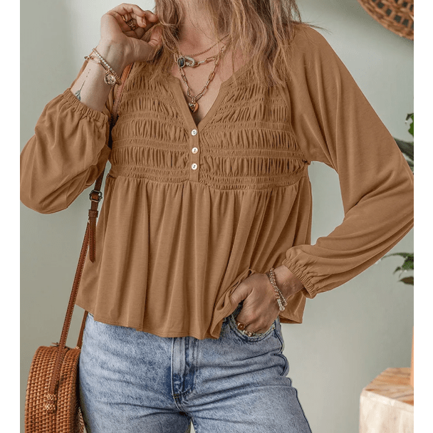 Kleo Cinnamon Smocked Bust Buttoned Split V Neck Flow Fit Blouse