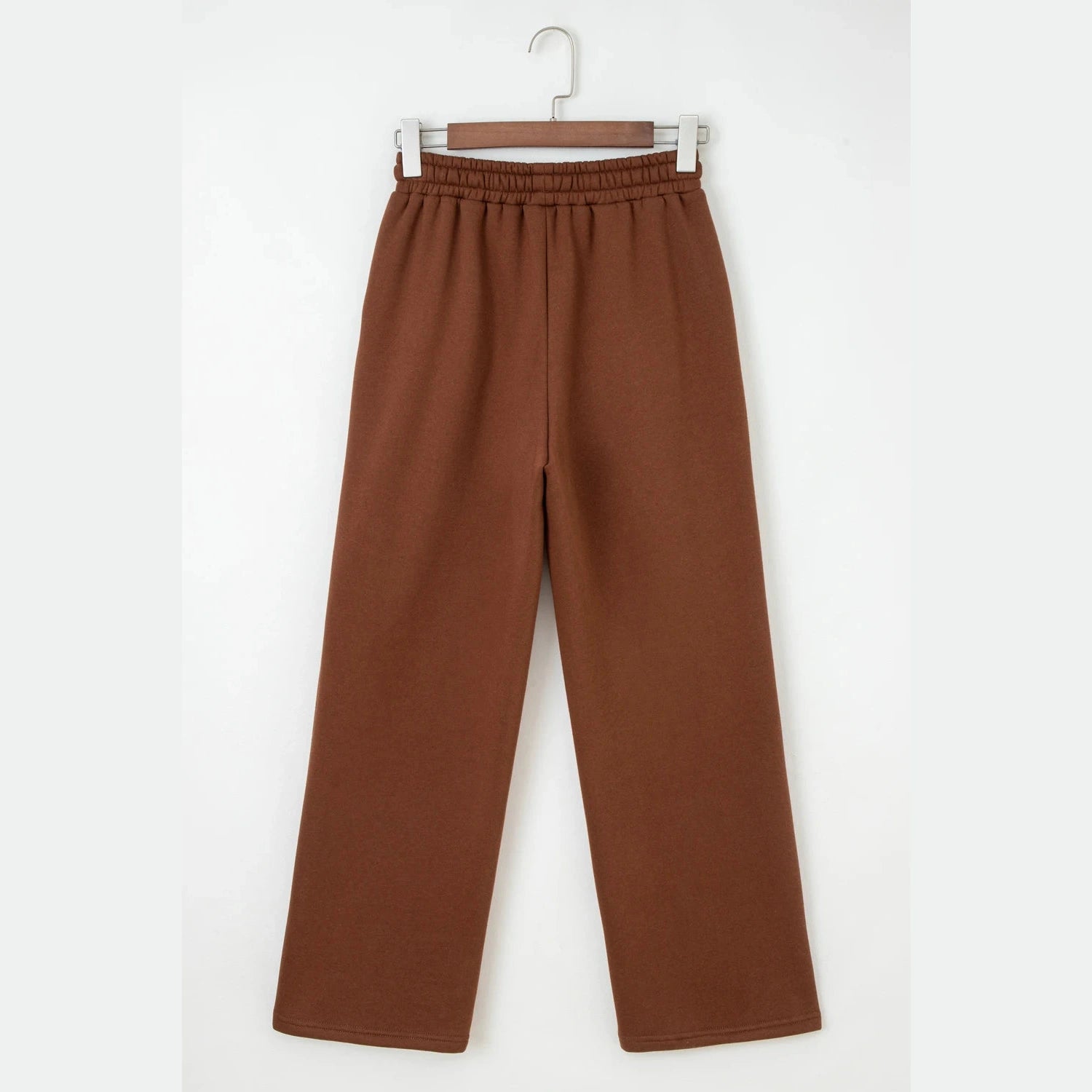 Lachelle Coffee Fleece Lined Leopard Drawstring Elastic Waist Solid Pants