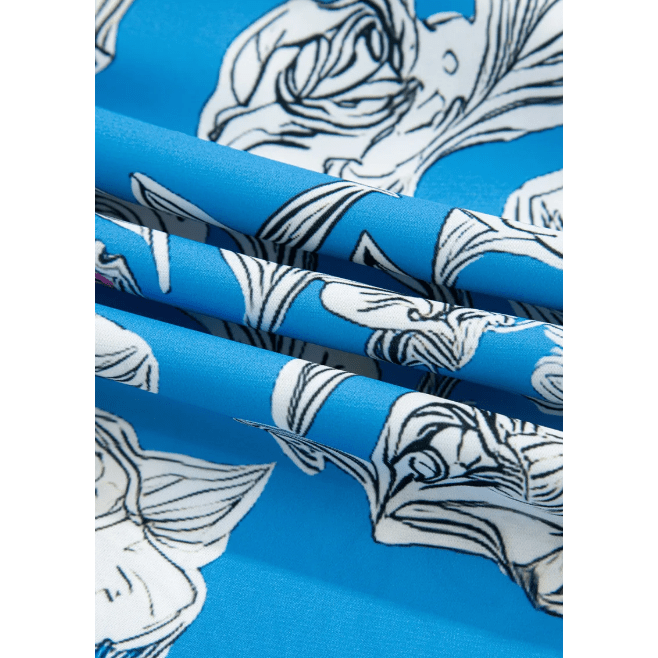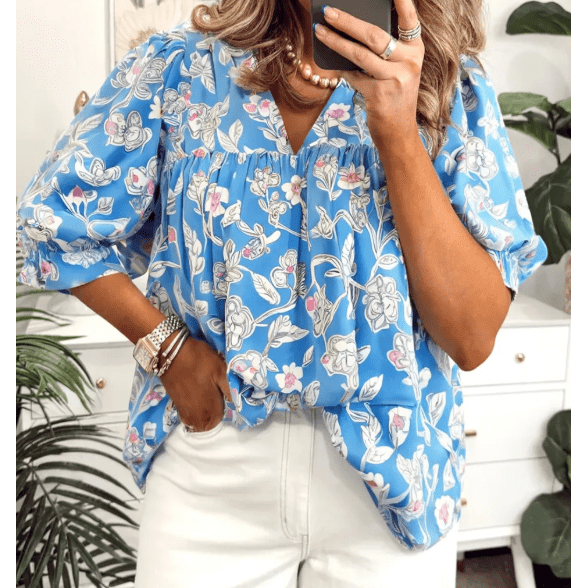 Lana Sky Blue V Neck Floral Print 3/4 Puff Sleeve Blouse