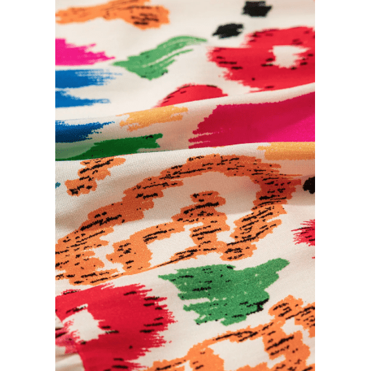 - This unique dress features an abstract print with a V-neckline and dolman sleeves.