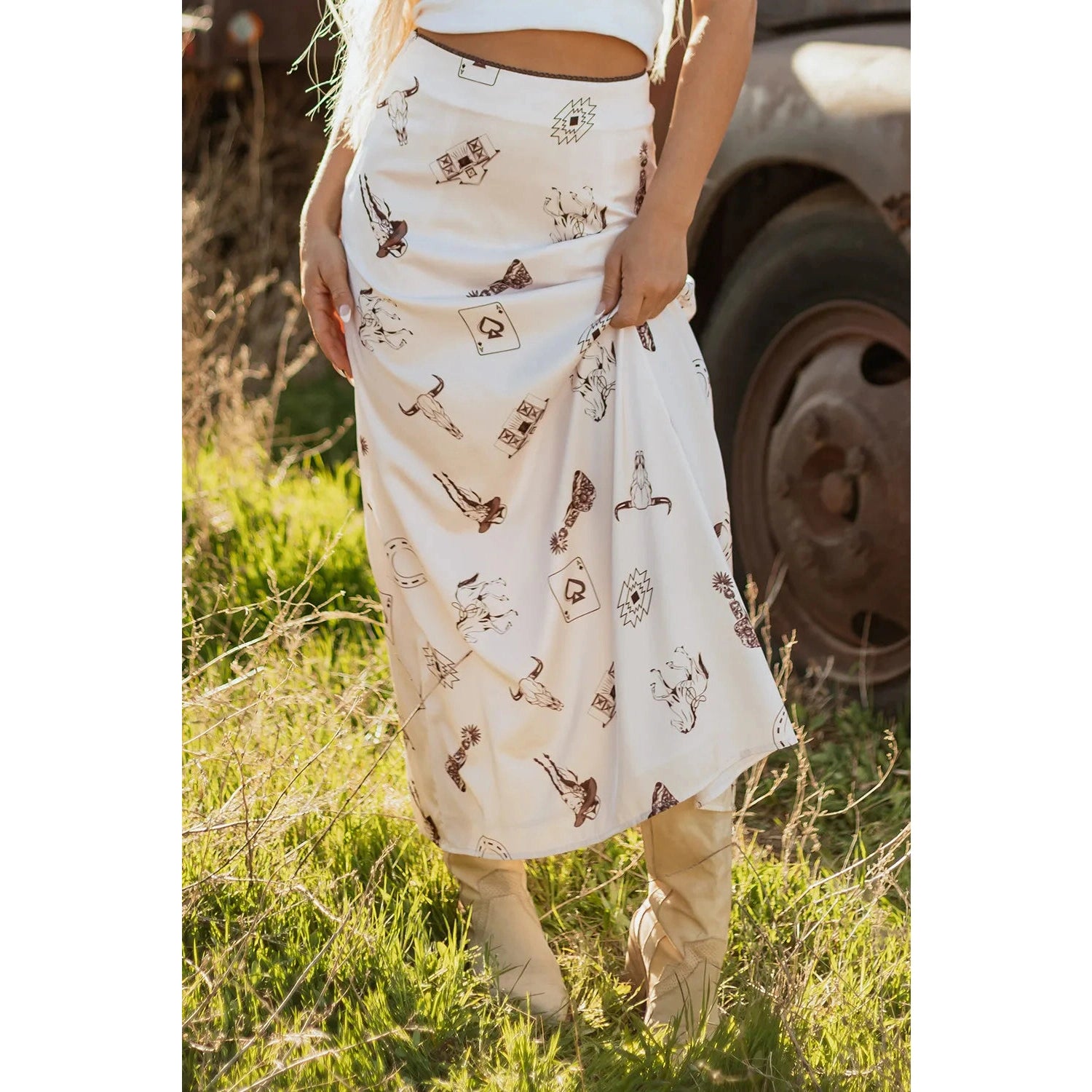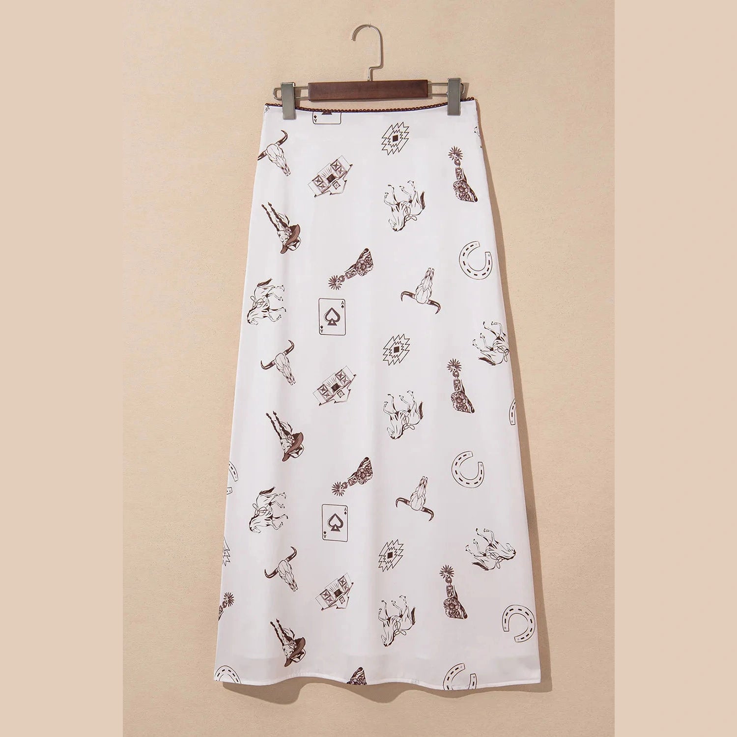 Lilee Beige Western Print Satin Long Skirt