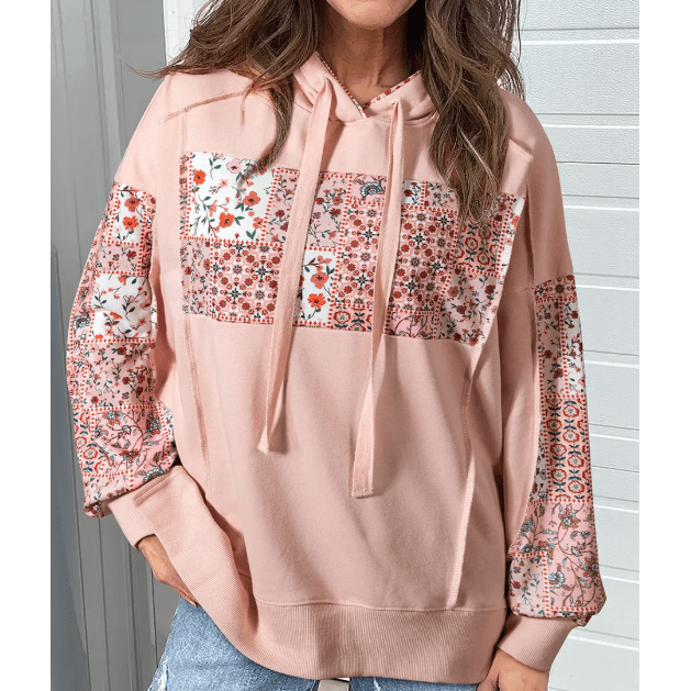 Loryn Blush Mix Floral Patchwork Side Slit Drawstring Hoodie