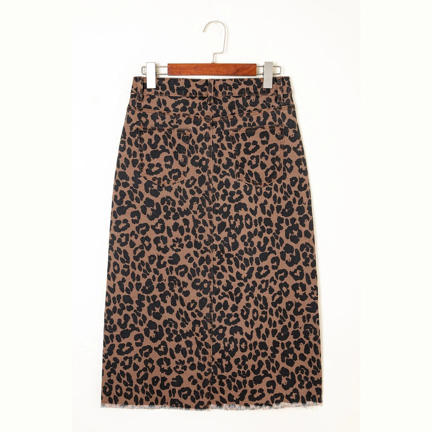 Lucille Brown Leopard Denim Frayed Split Denim Midi Skirt
