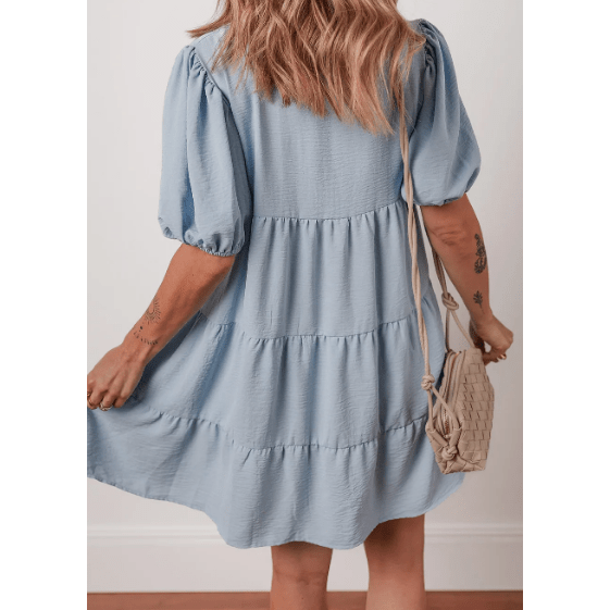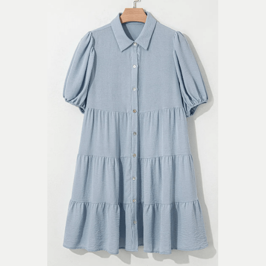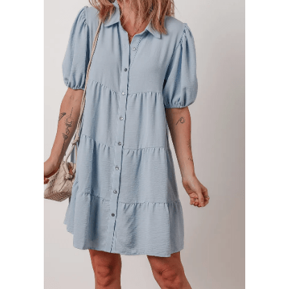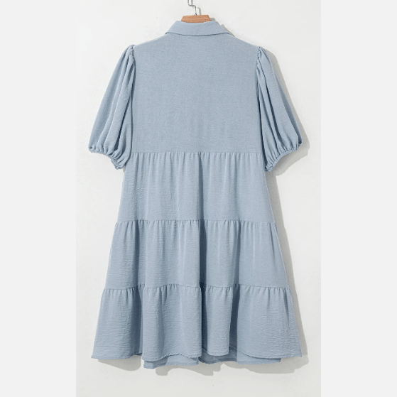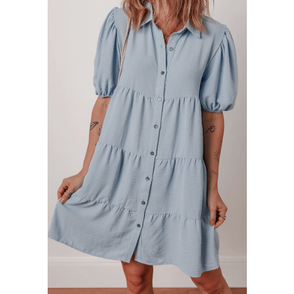 Luna Beau Blue Shirt Collar Button Up Short Puff Sleeve Tiered Shift Dress