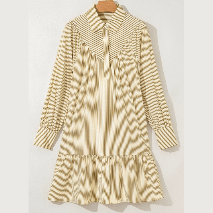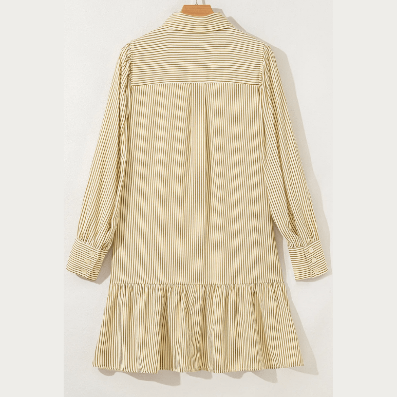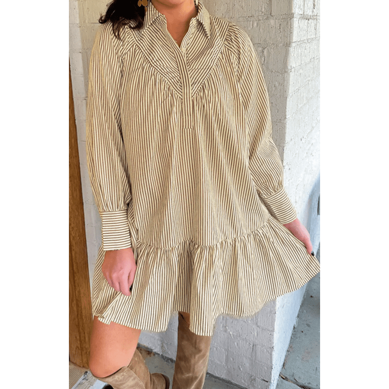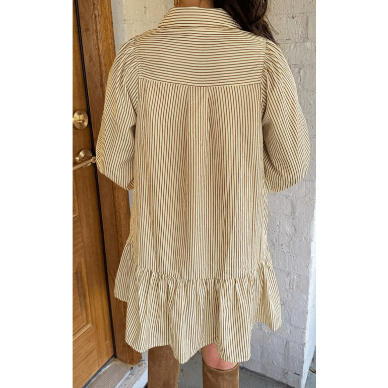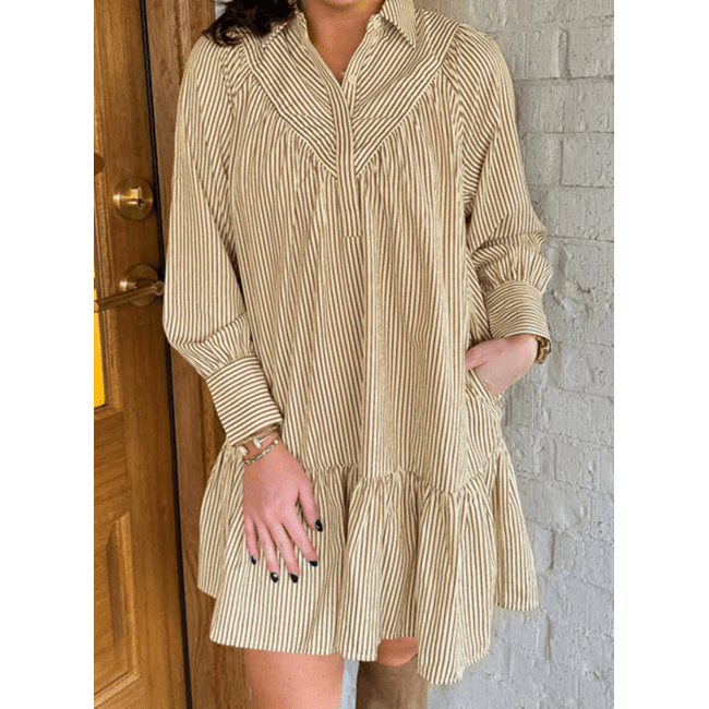 Madlin Brown Stripe Collared Neck Cuffed Long Sleeve Drop Waist Mini Dress