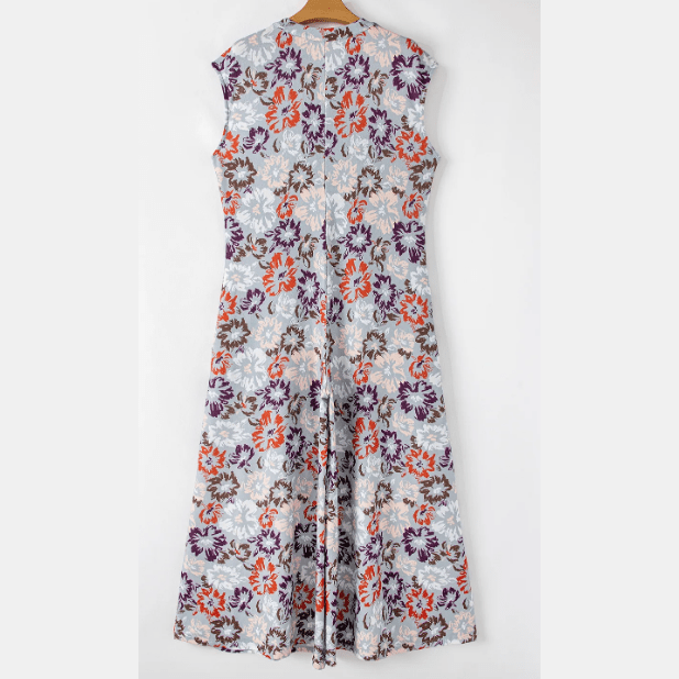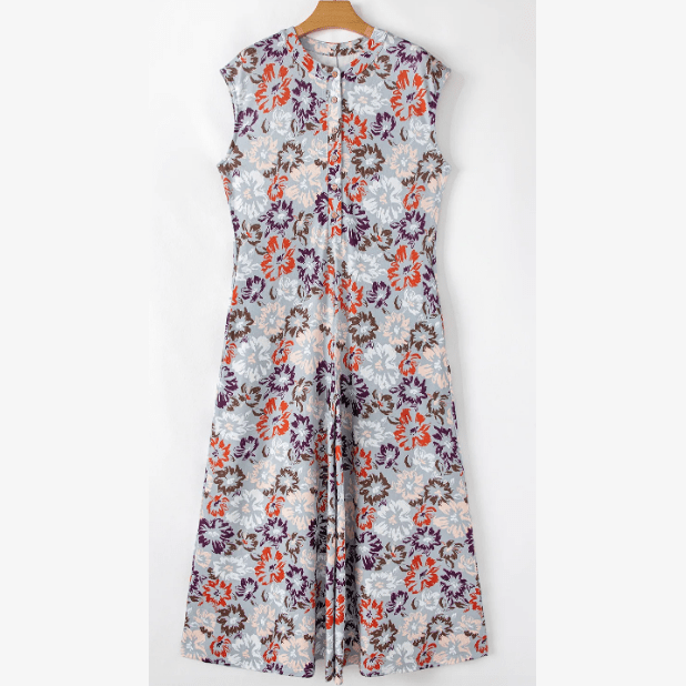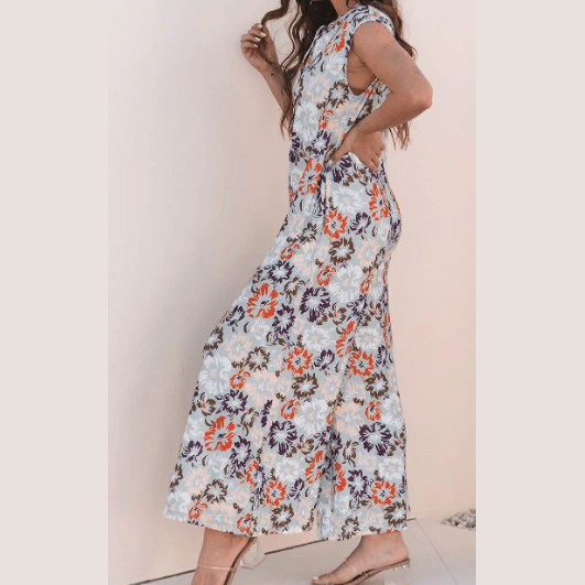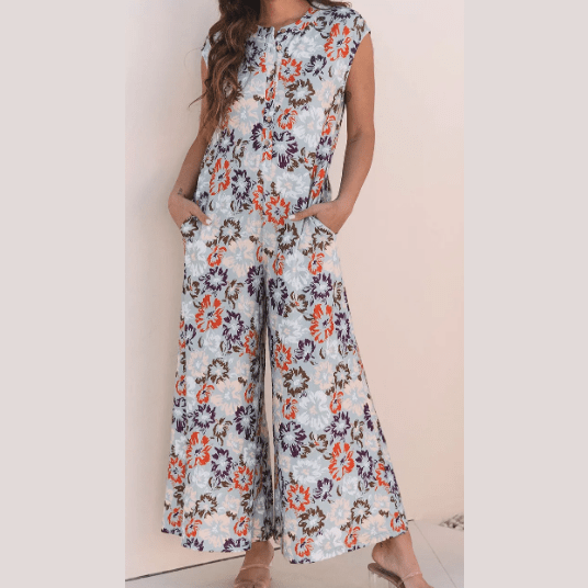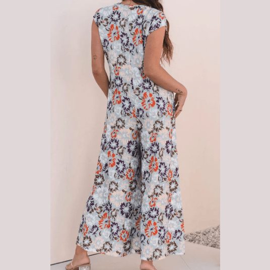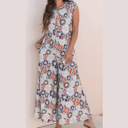 Maralie Sky Blue Floral Sleeveless Buttoned Pocketed Wide Leg Jumpsuit