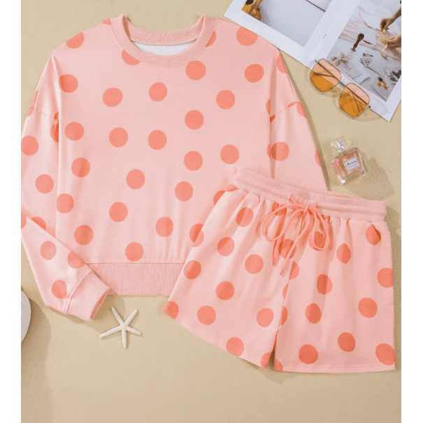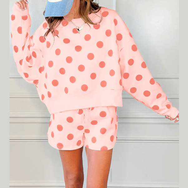 - A versatile polka dot lounge set that pairs easily with sneakers or slides.