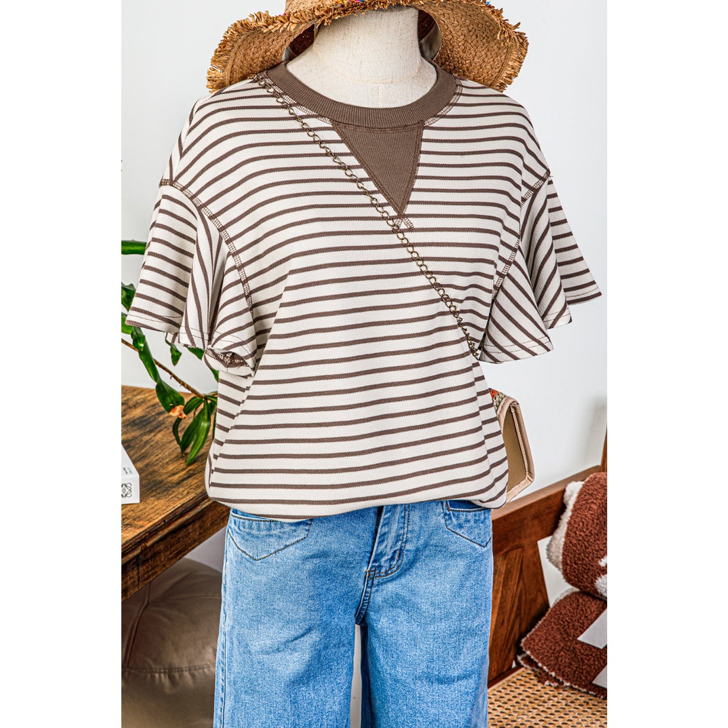 Maritsa Brown Contrast Detail Striped Ruffle Short Sleeve Top
