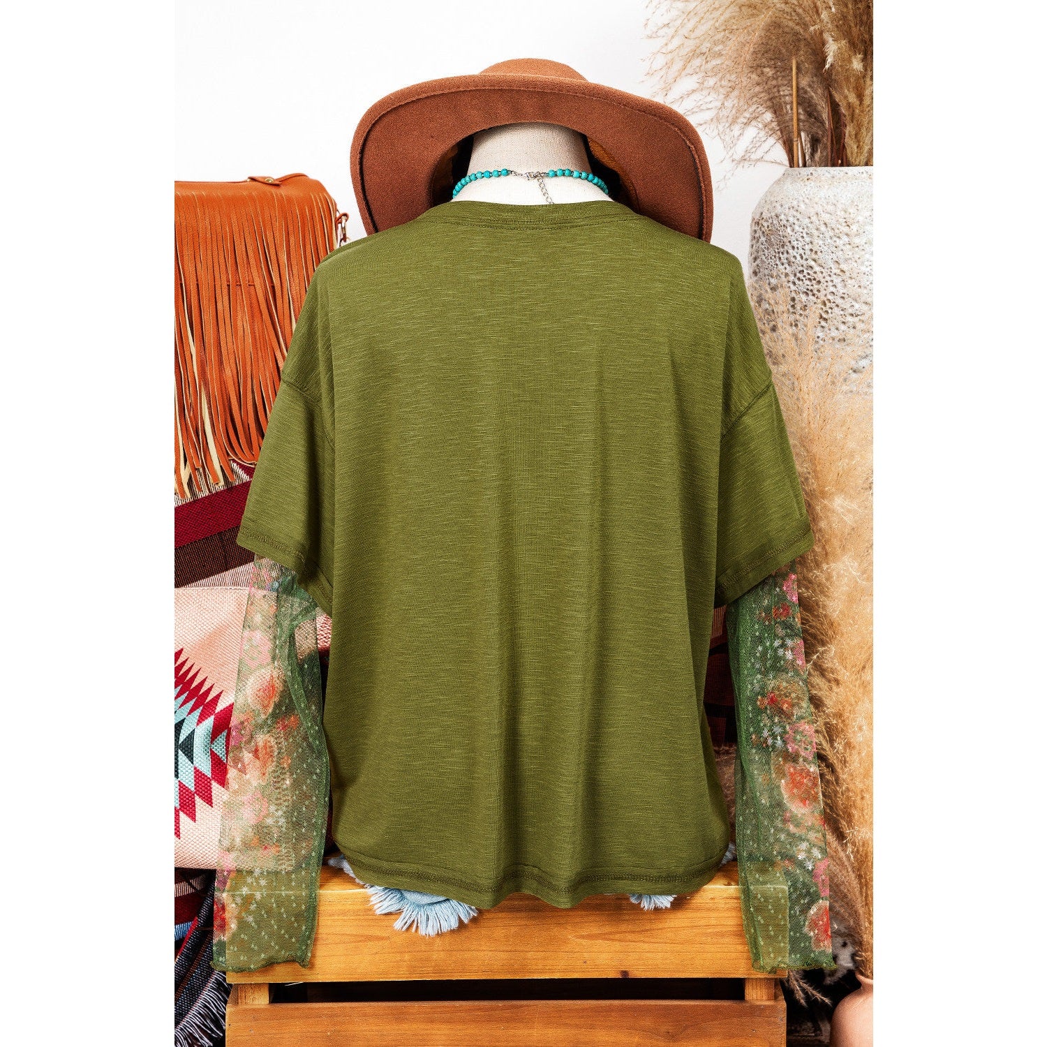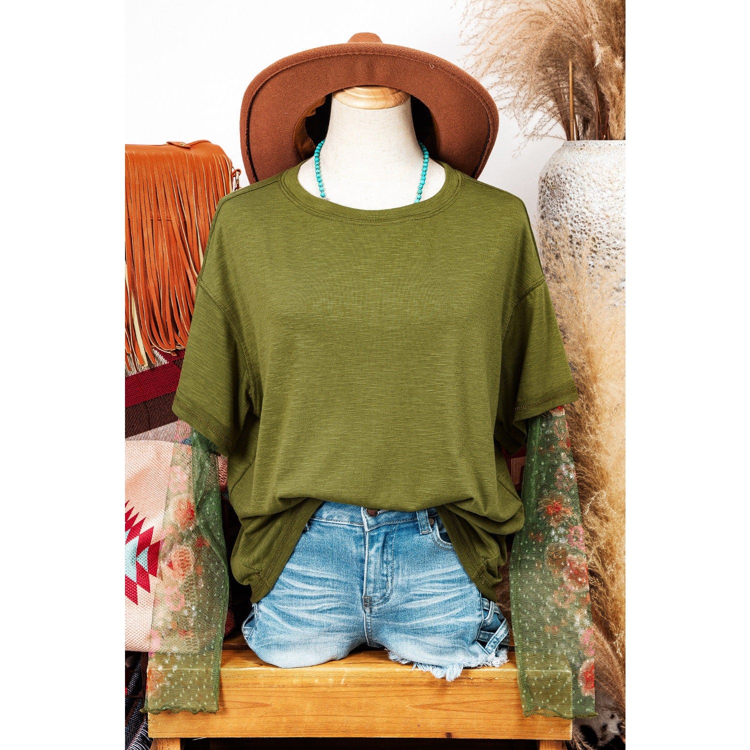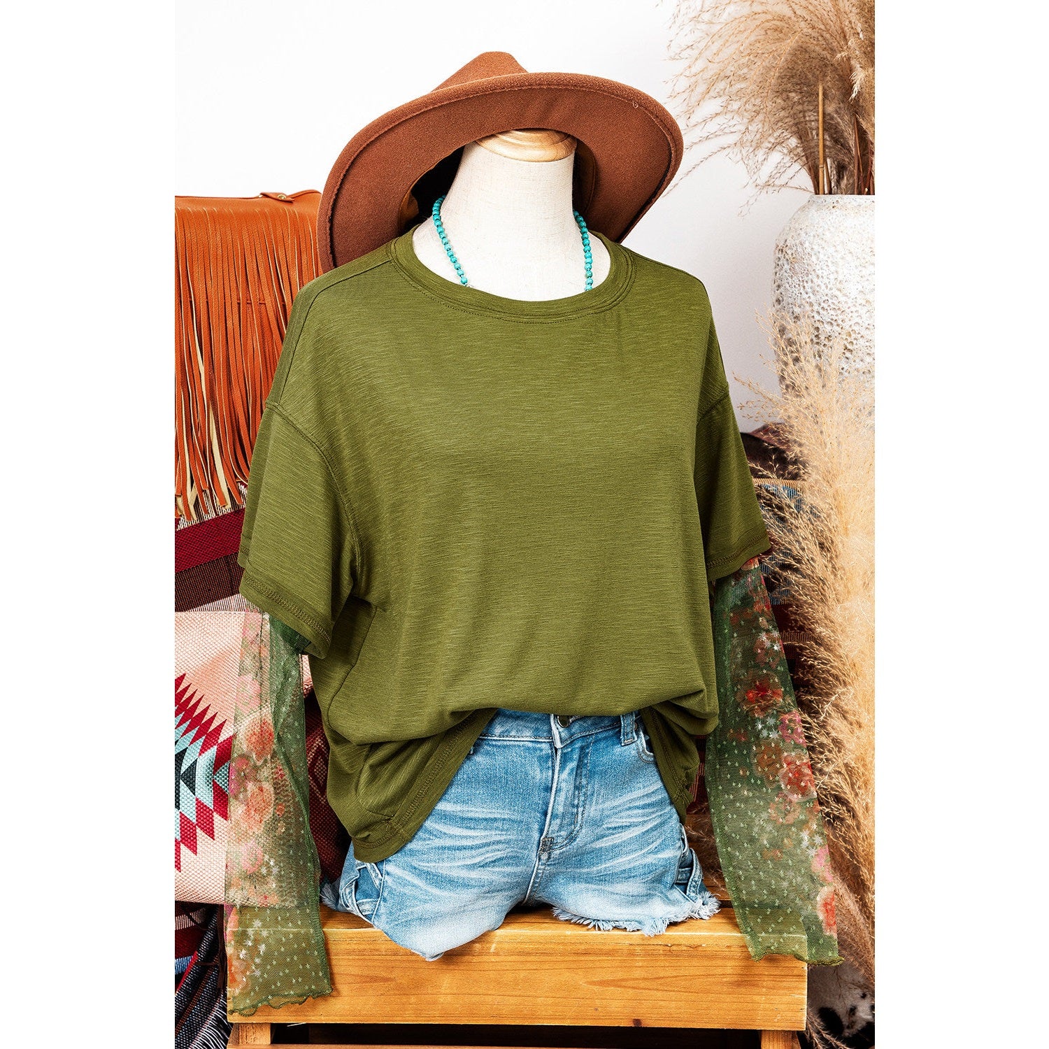 - It features a loose t shirt patchwork with faux under shirt floral mesh sleeve.
