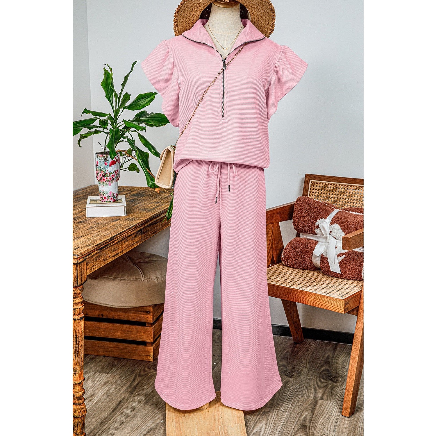 Melinda Pink Textured Ruffled Sleeve Zipped Top and Wide Leg Pants Set