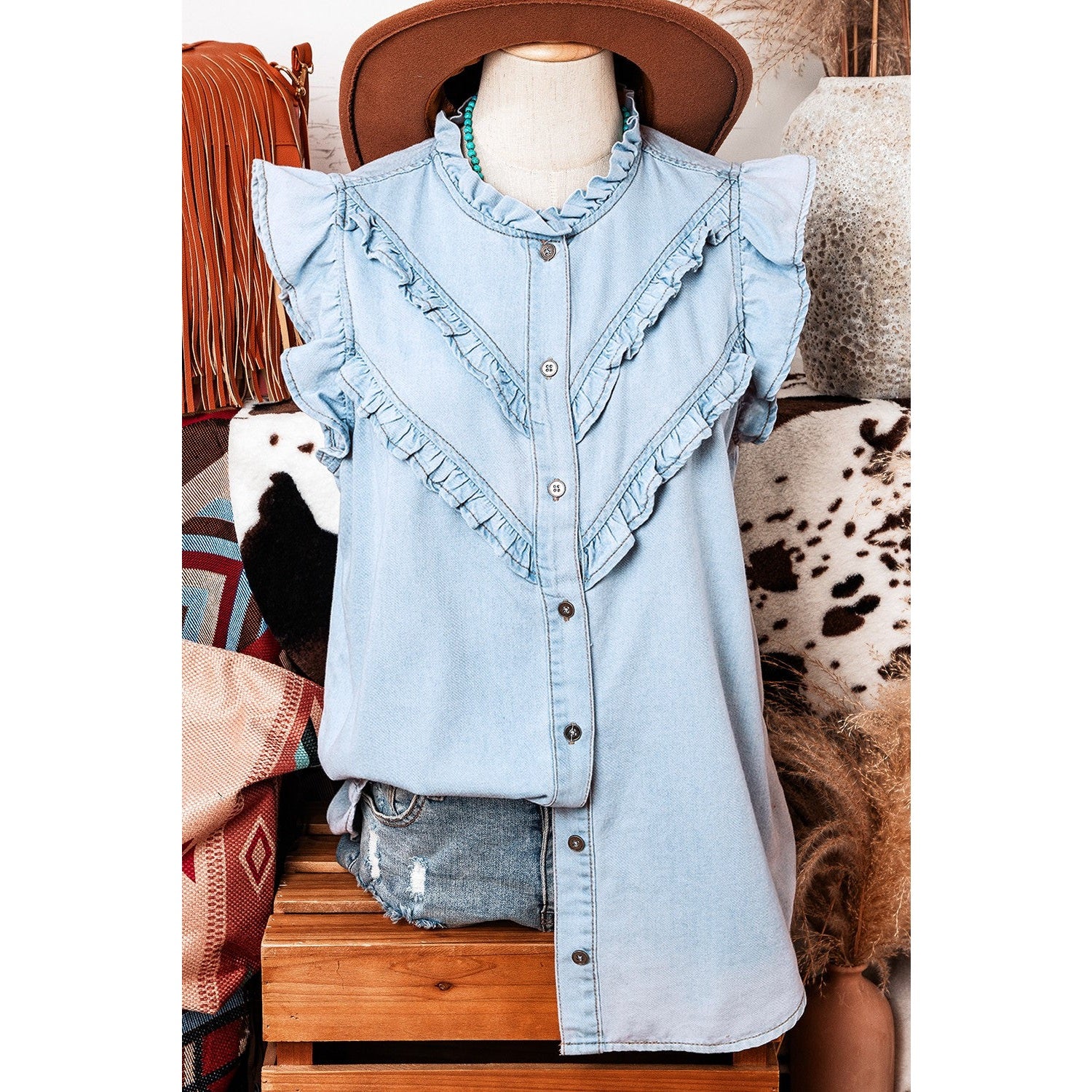 Micha Beau Blue Mineral Wash Cap Sleeve Frilled Button Up Denim Shirt