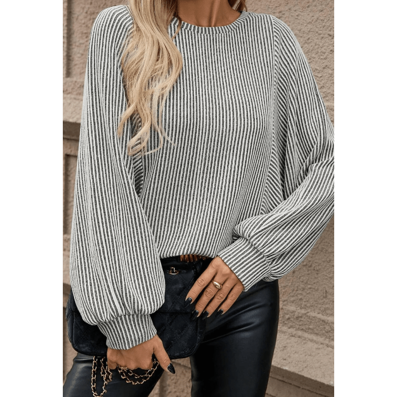 Mirabella Ribbed Knit Round Neck Long Lantern Sleeve Top