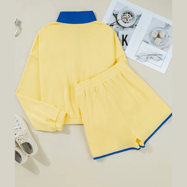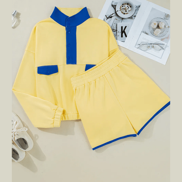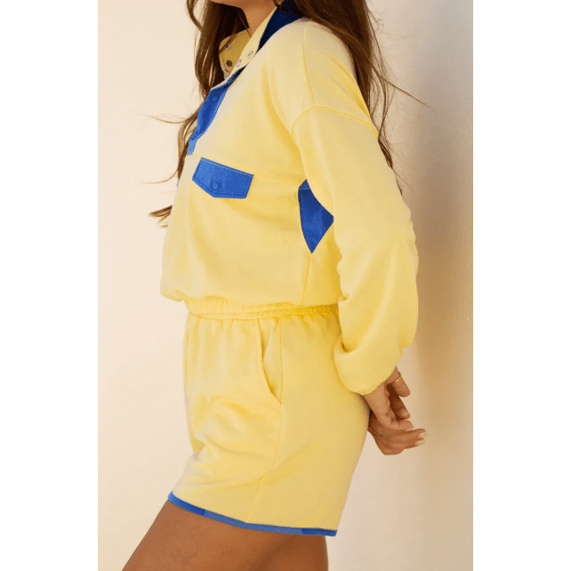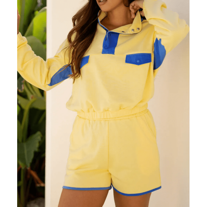 Misha Yellow Color Block Patchwork Half Button Pullover and Shorts 2pcs Outfit
