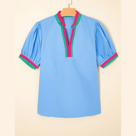 Nancie Sky Blue Contrast Striped V Neck Collision Short Puff Sleeve Blouse