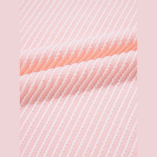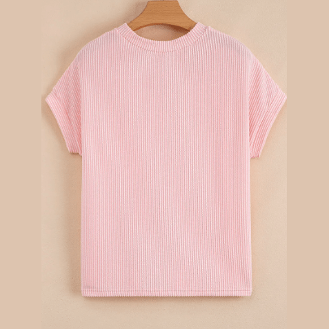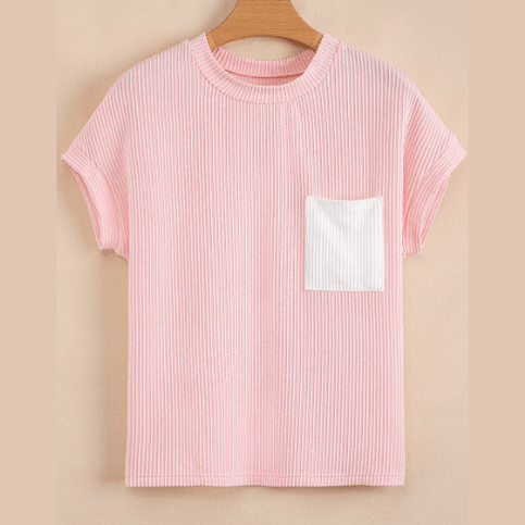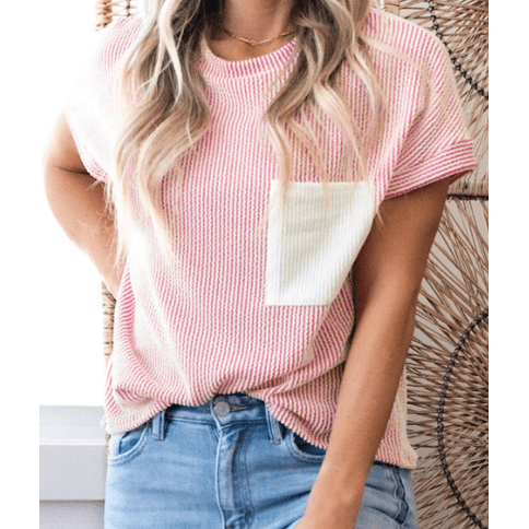 Noelle Pink Corded Knit Color Block Pocketed Crew Neck T Shirt