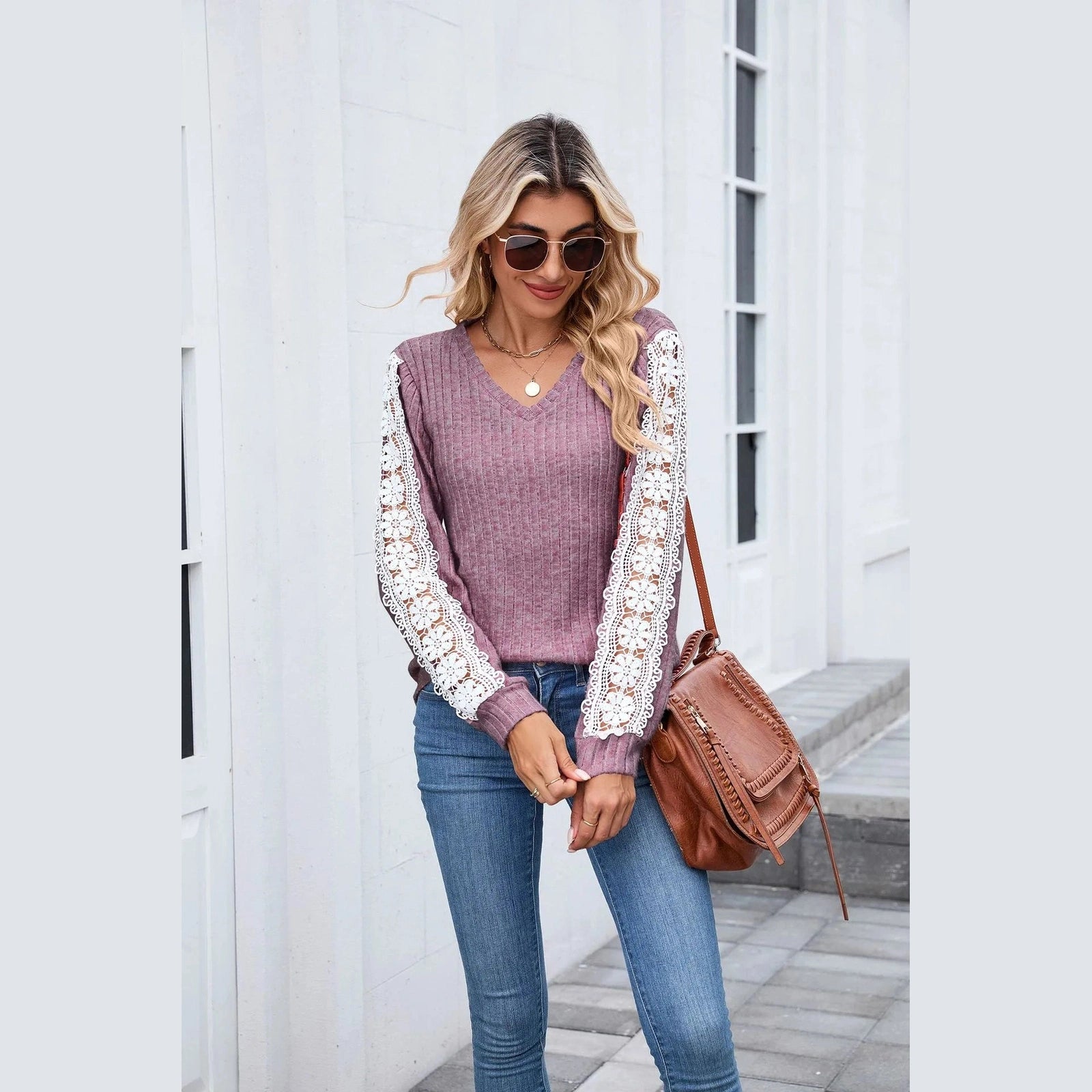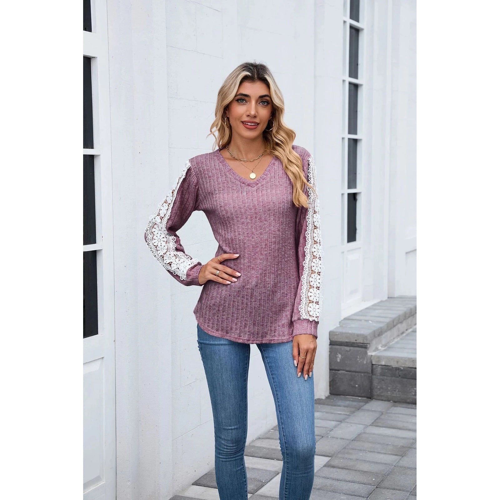 Nora Purple Ribbed Lace Trim Long Sleeve Top